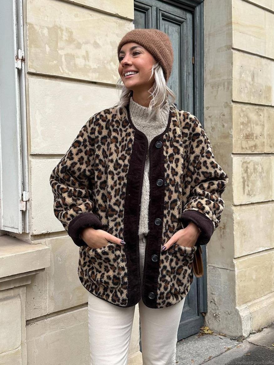• Women Leopard Print Faux Fur Jacket Sherpa Fleece Coat Corduroy Trim Round Neck Loose Casual Long Sleeve Button Down Streetwear Autumn Winter Outwear