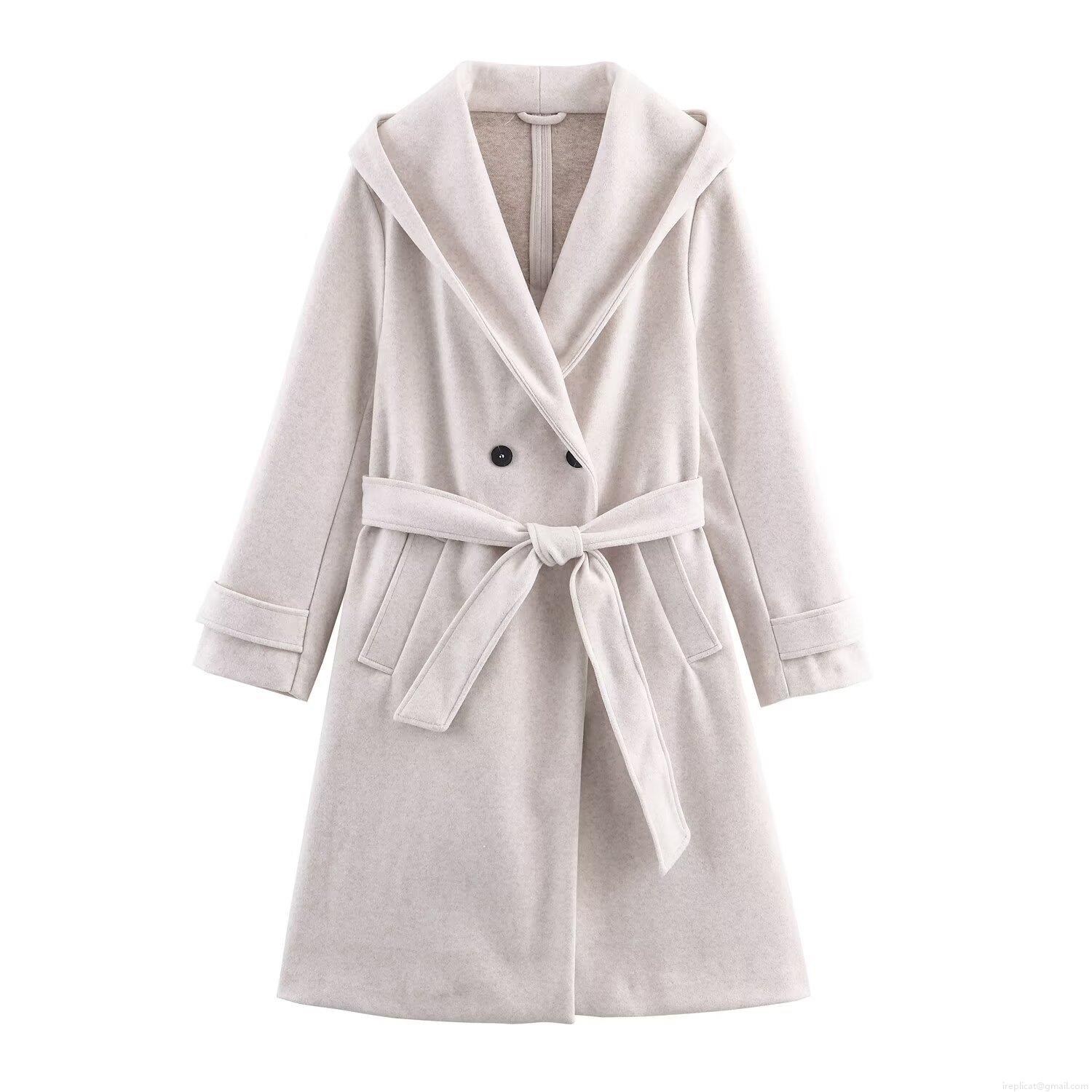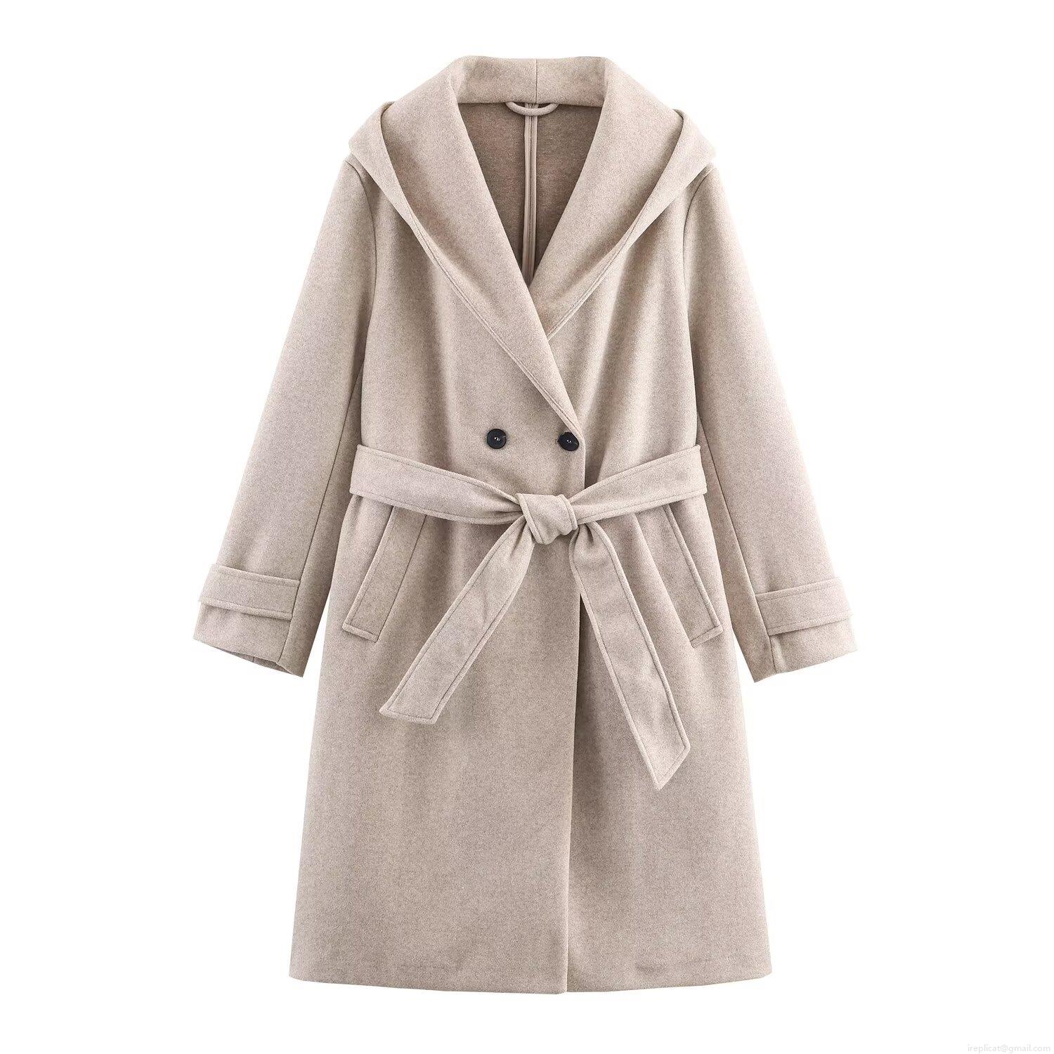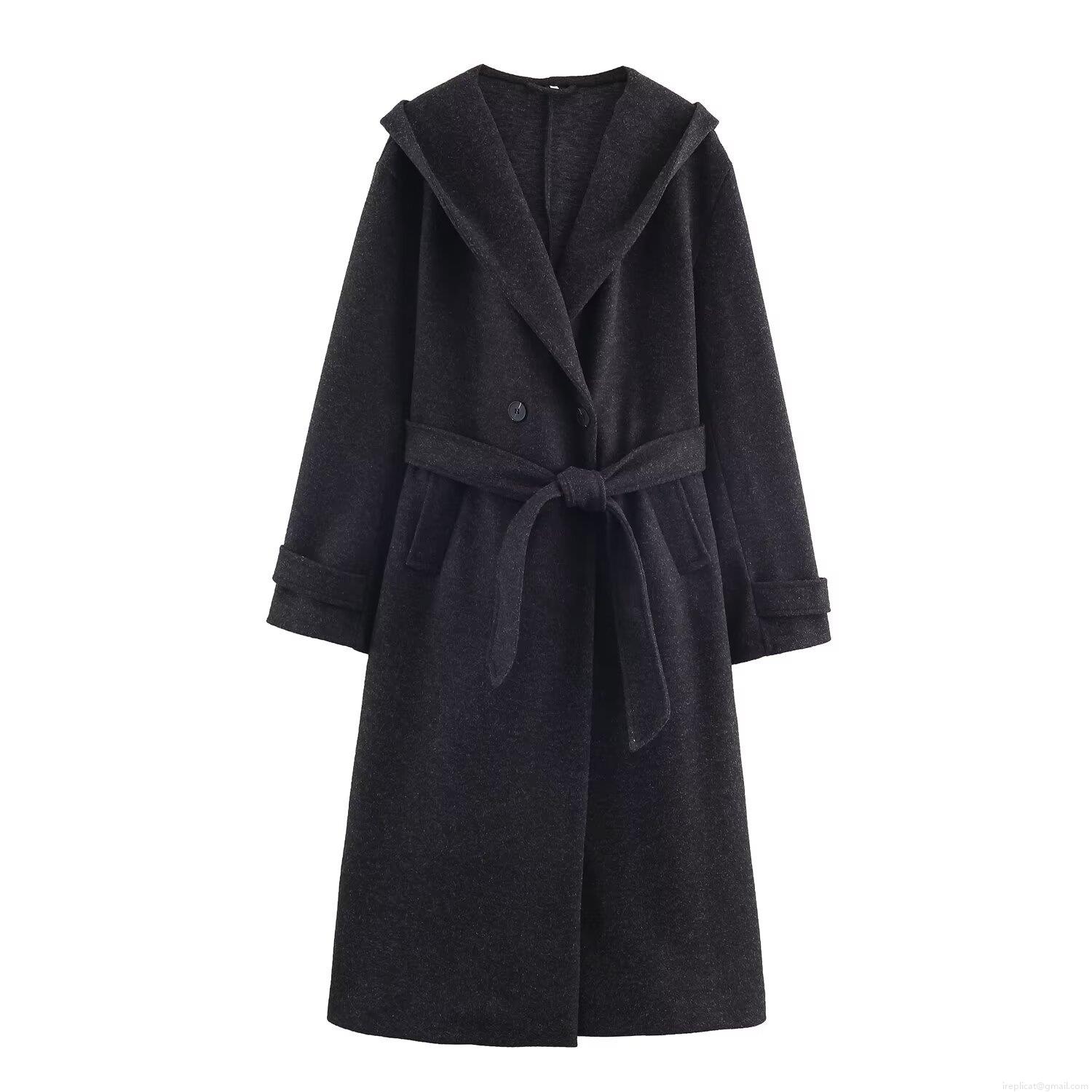 • Women Long Hooded Woolen Coat Double Breasted Belted Trench Jacket Winter Warm Loose Overcoat Solid Color Outwear Elegant Casual Ladies Fashion Coat