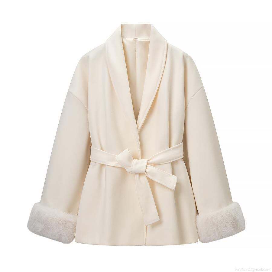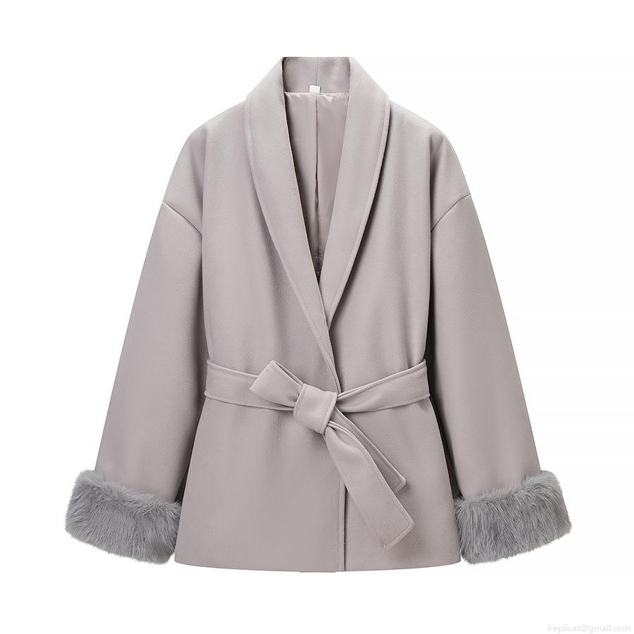 • Women Mid-Length Woolen Coat With Faux Fur Cuffs And Waist Tie Elegant V-Neck Long Sleeve Outerwear Jacket For Winter Autumn Ladies