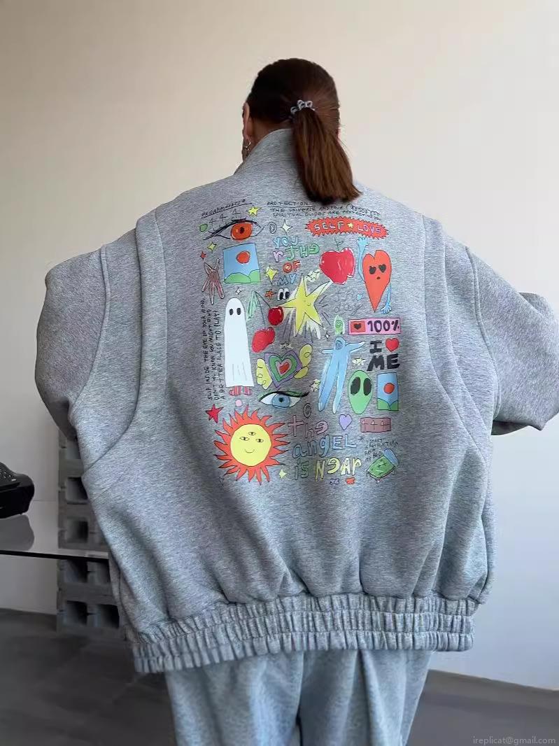 Women Oversized Grey Letter Print Stand Collar Zipper Jacket Streetwear Colorful Graffiti Cotton Blend Autumn Winter Loose Flight Suit Outerwear Hoodie