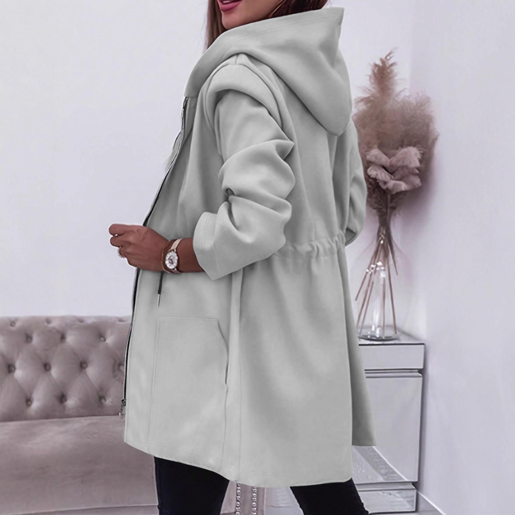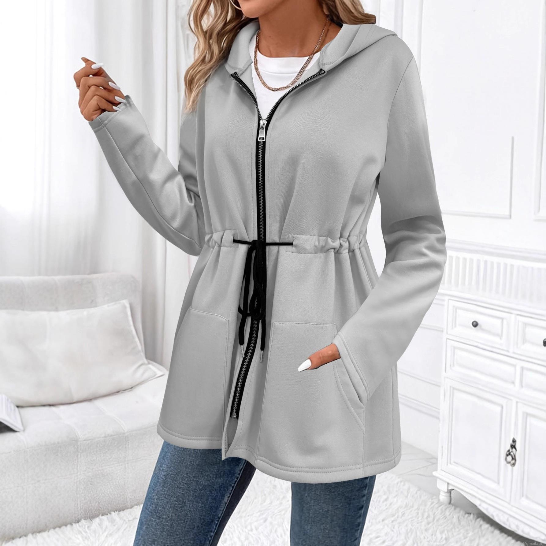 • Women Plus Size Hooded Fleece Jacket-Casual Mid-Length Drawstring Waist Zip-Up Sweatshirt Coat-Autumn Winter Solid Color Warm Long Sleeve Outwear