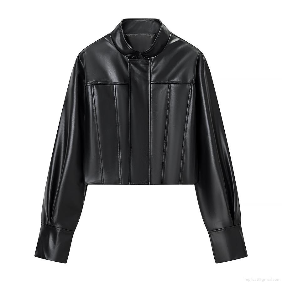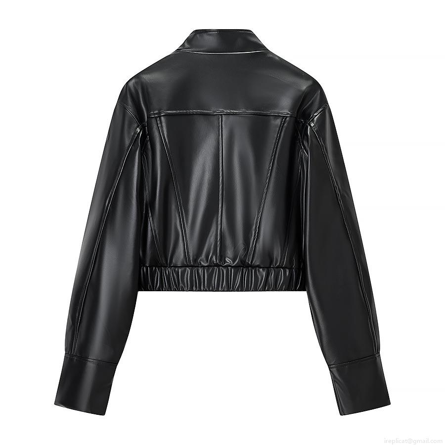 • Women PU Leather Jacket Stand Collar Long Sleeve Zipper Bomber Jacket Outerwear European Street Style Short Biker Coat Lady Black Solid Color Autumn