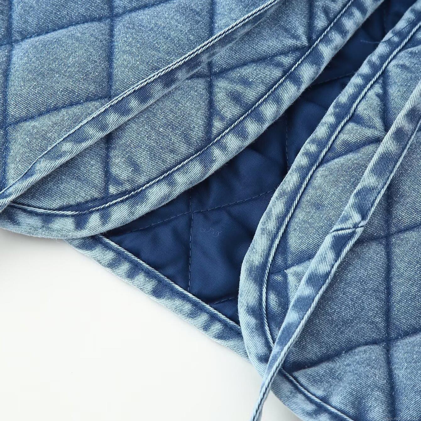Women Quilted Denim Jacket Ruffle Collar Washed Cotton Padded Outerwear With Bow Tie Front Long Sleeve Casual Fashion Coat For Lady