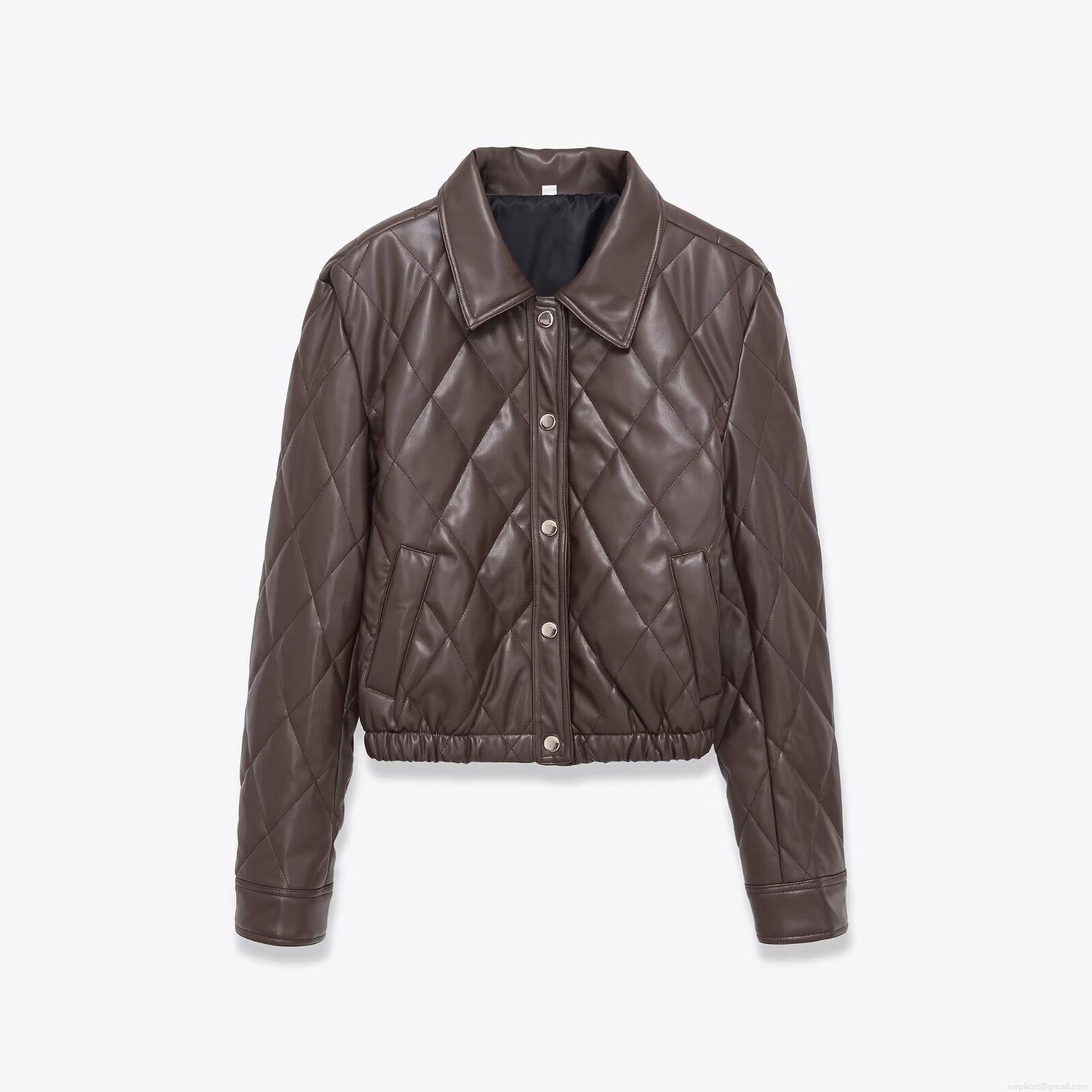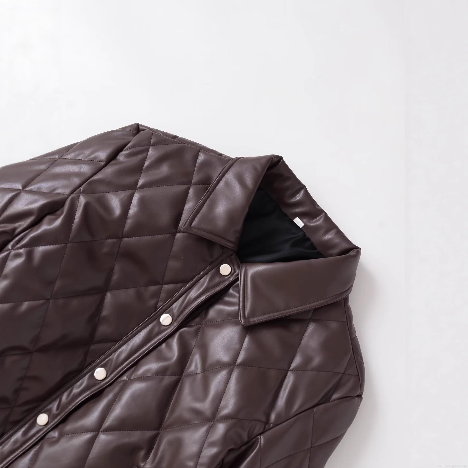 • Women Quilted PU Leather Jacket Fashion Lapel Short Puffer Coat With Metal Buttons Coffee Solid Color Chic Outerwear For Autumn Winter Lady