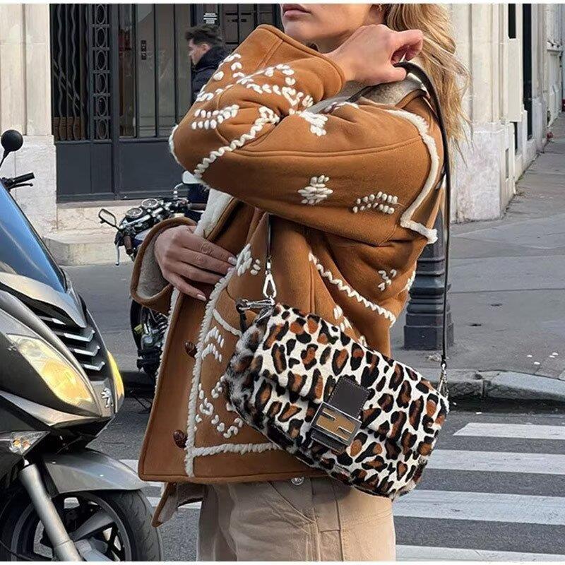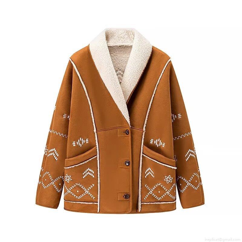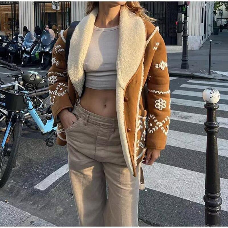• Women Retro Ethnic Embroidered Suede Jacket With Faux Lamb Wool Trim Bohemian Lapel Single Breasted Warm Winter Outerwear Casual Coat