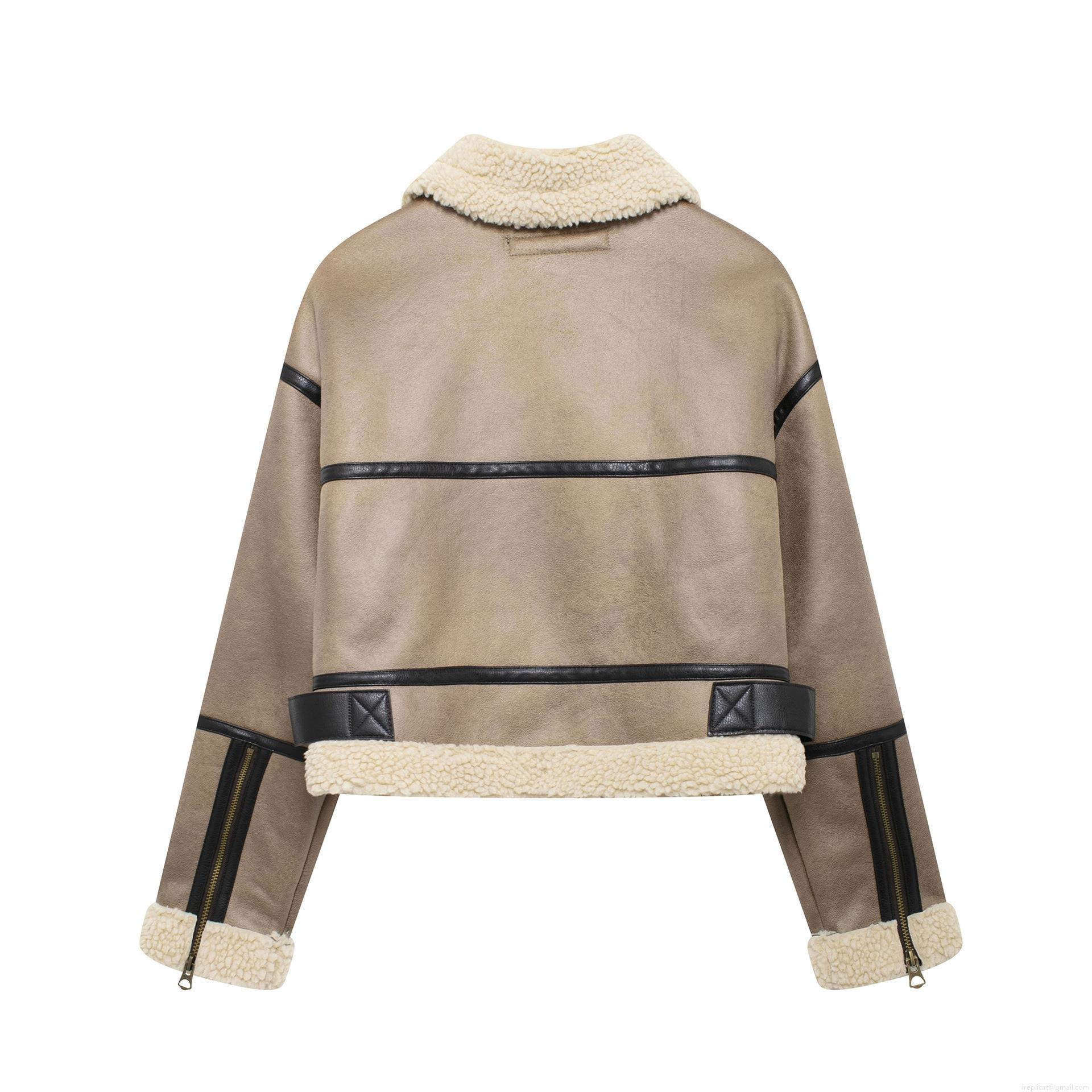 Women Retro Faux Suede Shearling Aviator Jacket Vintage Motorcycle Style Lapel Collar Zipper Fly Short Coat Warm Winter Outwear