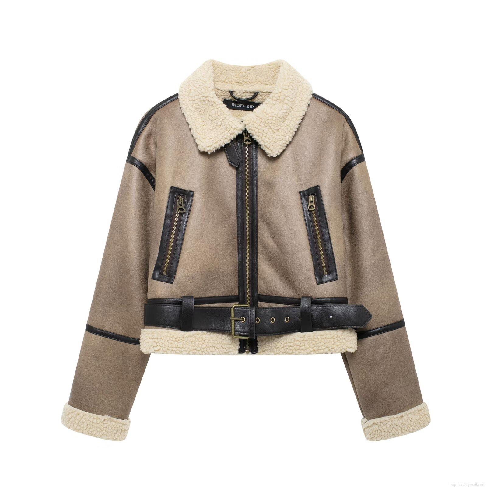Solid Color, Splice, Pocket, Zipper, Leather Trim, Belt Buckle, Lambswool Collar