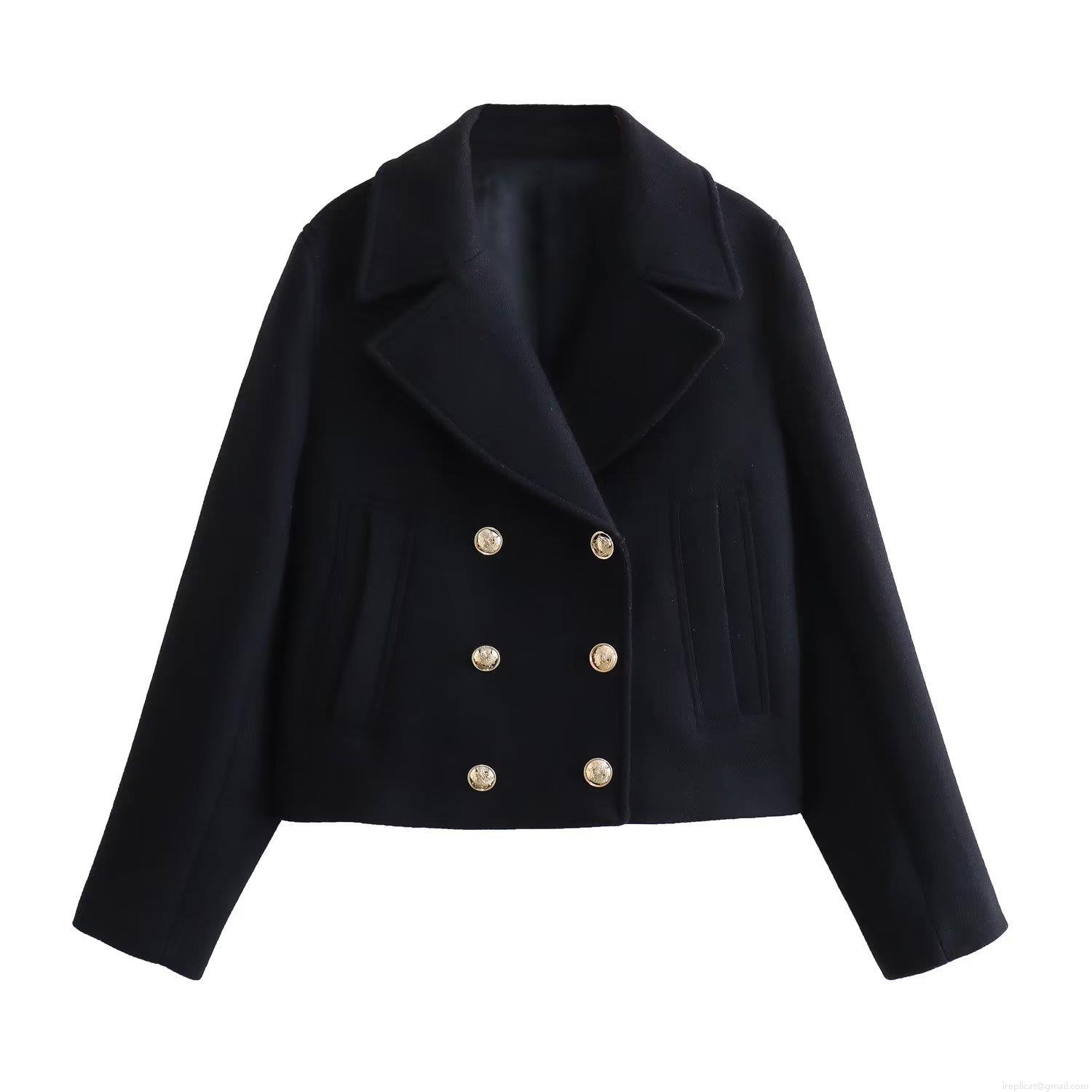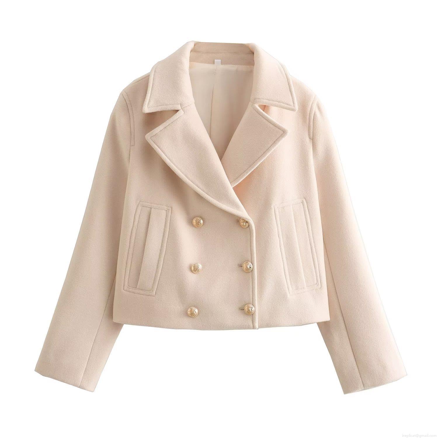 Women Short Double Breasted Woolen Coat Fashion Lapel Jacket With Gold Buttons Elegant Solid Color Outerwear For Office Daily Wear Lady Spring Autumn