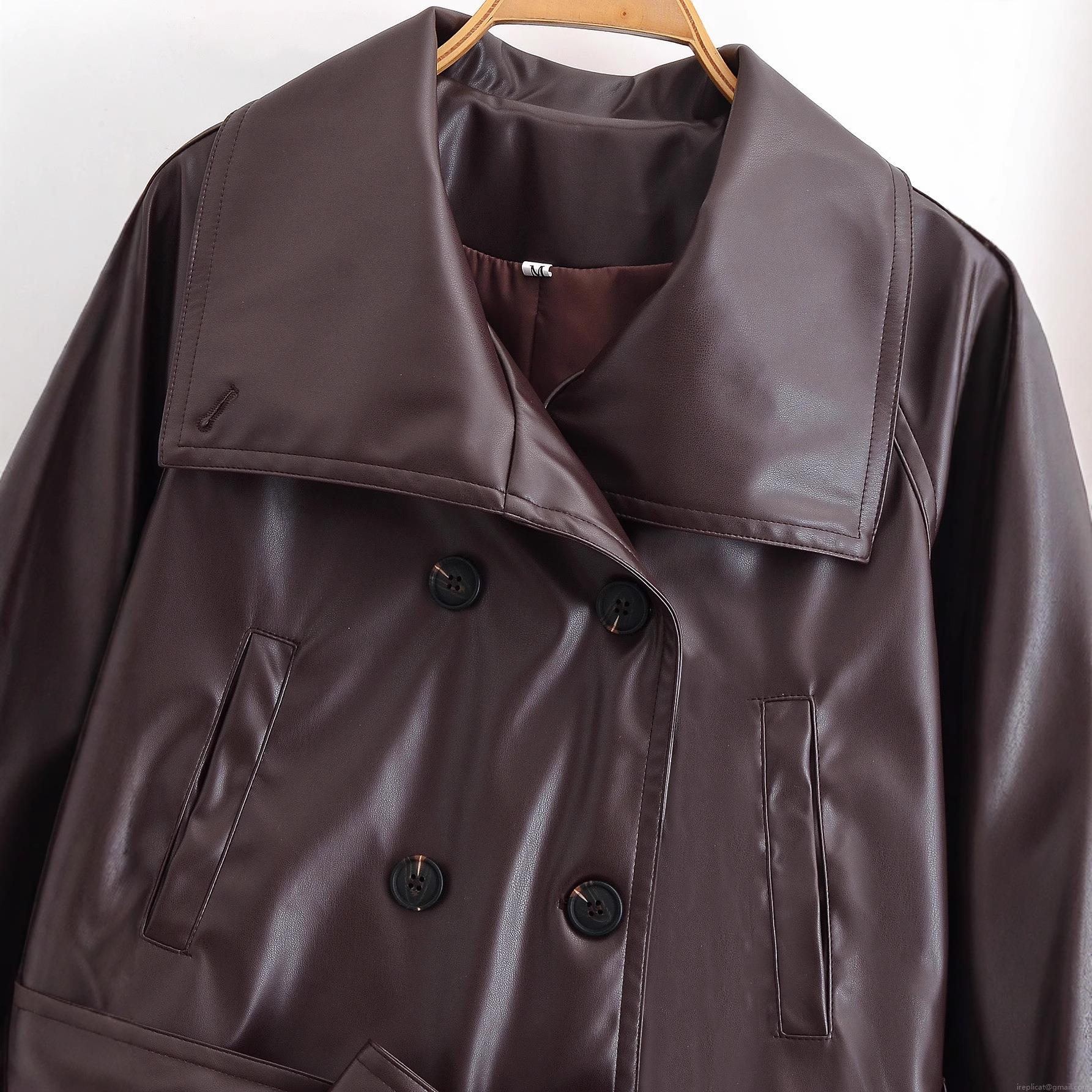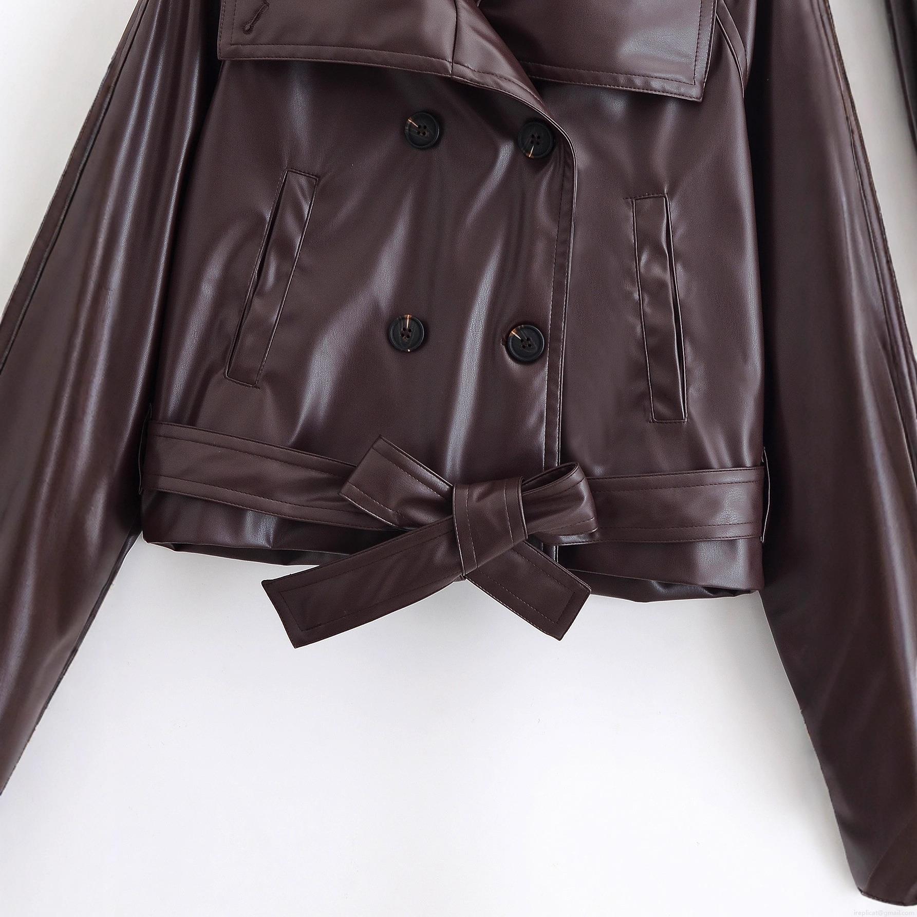 • Women Short Leather Jacket PU Faux Leather Double Breasted Lapel Collar With Bow Belt Deep Brown Maroon Long Sleeve Windproof Streetwear Fashion Outerwear
