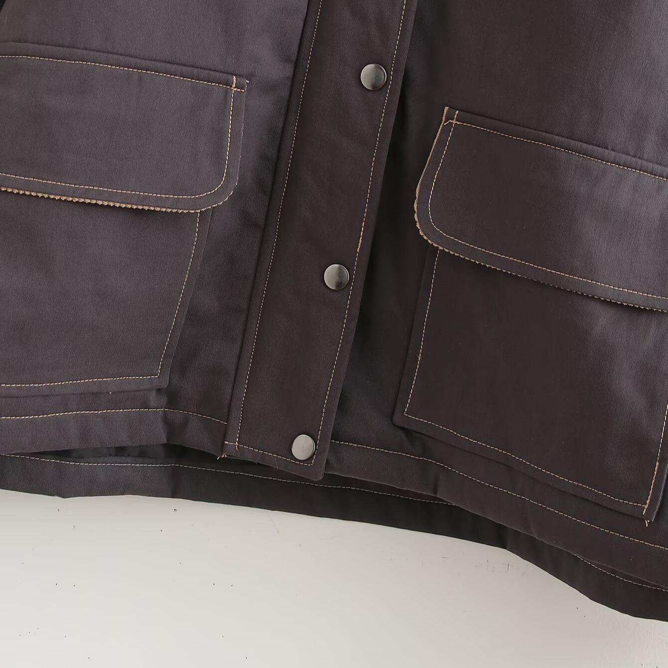 Women Splicing Workwear Jacket Corduroy Lapel Polyester Long Sleeve Button Up Coat Casual Autumn Loose Fit Outerwear With Pockets