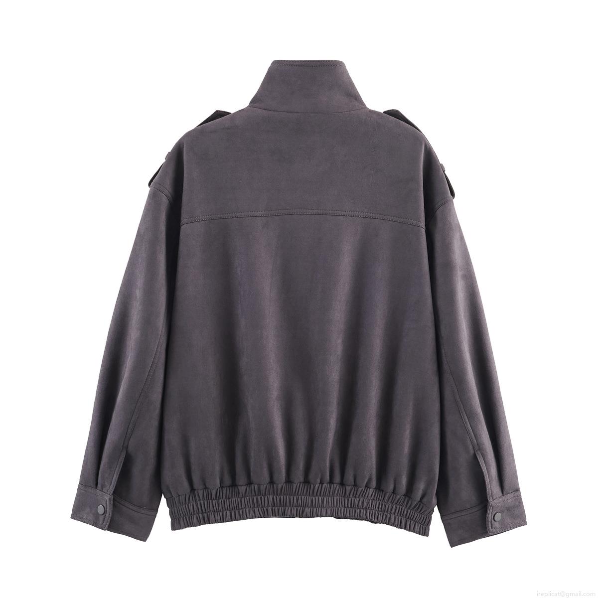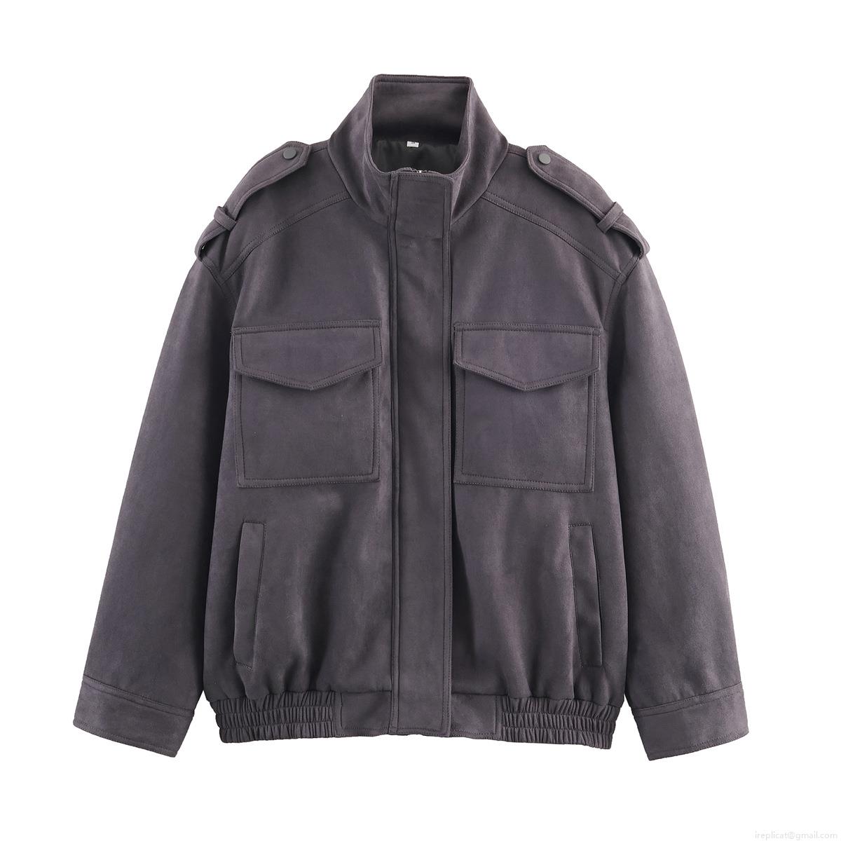 • Women Stand Collar Faux Suede Jacket Utility Cargo Outerwear Shoulder Straps Large Pockets Loose Fit Casual Streetwear Long Sleeve Coat For Women