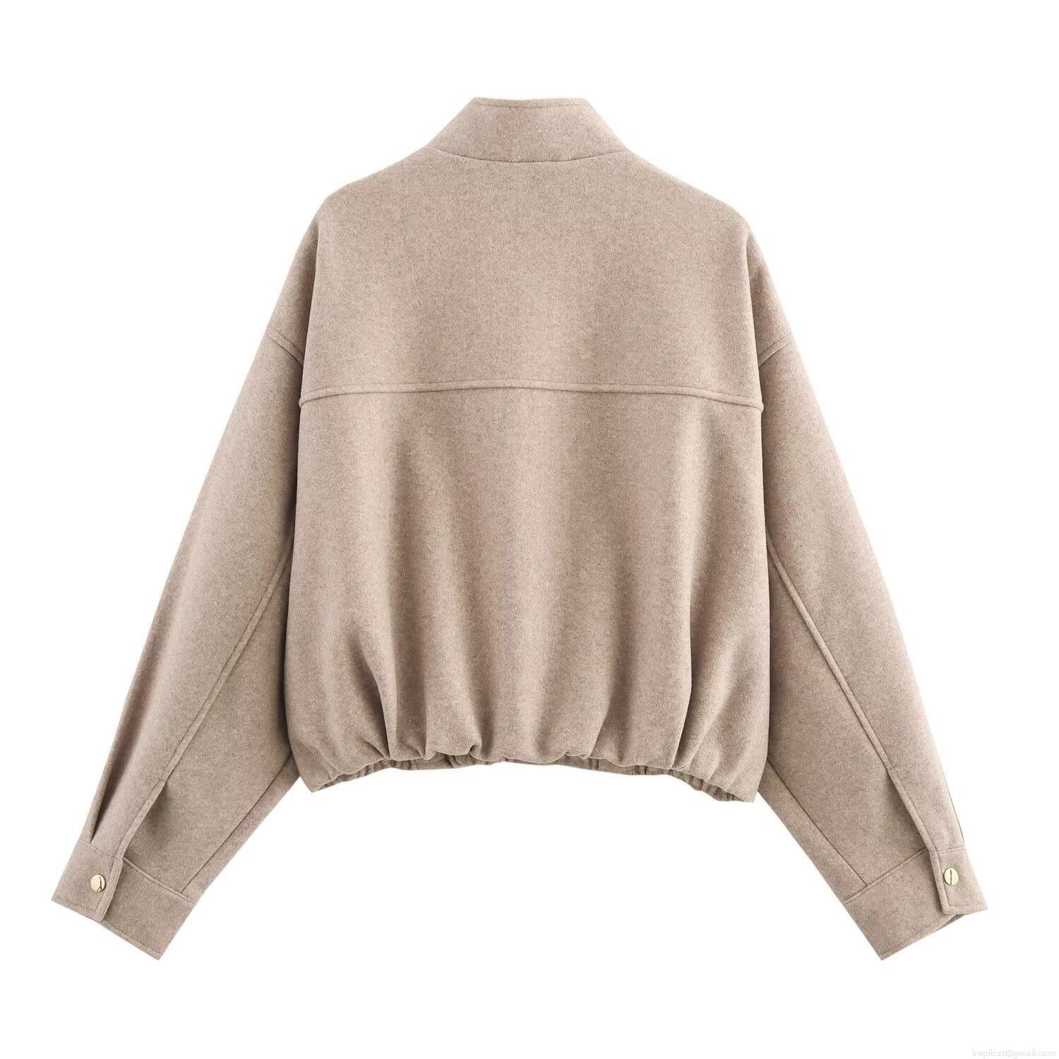 Women Stand Collar Woolen Jacket Solid Color Metal Zipper Short Coat Long Sleeve Casual Street Style Outwear Pocket Bomber Jacket