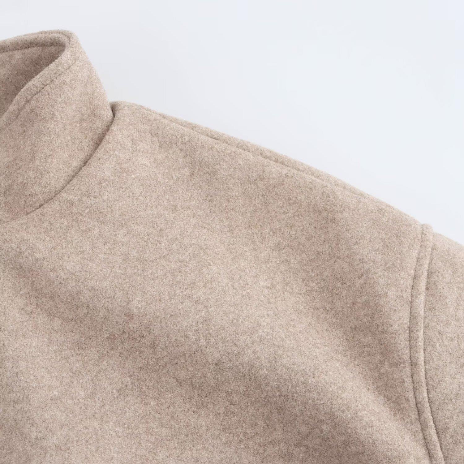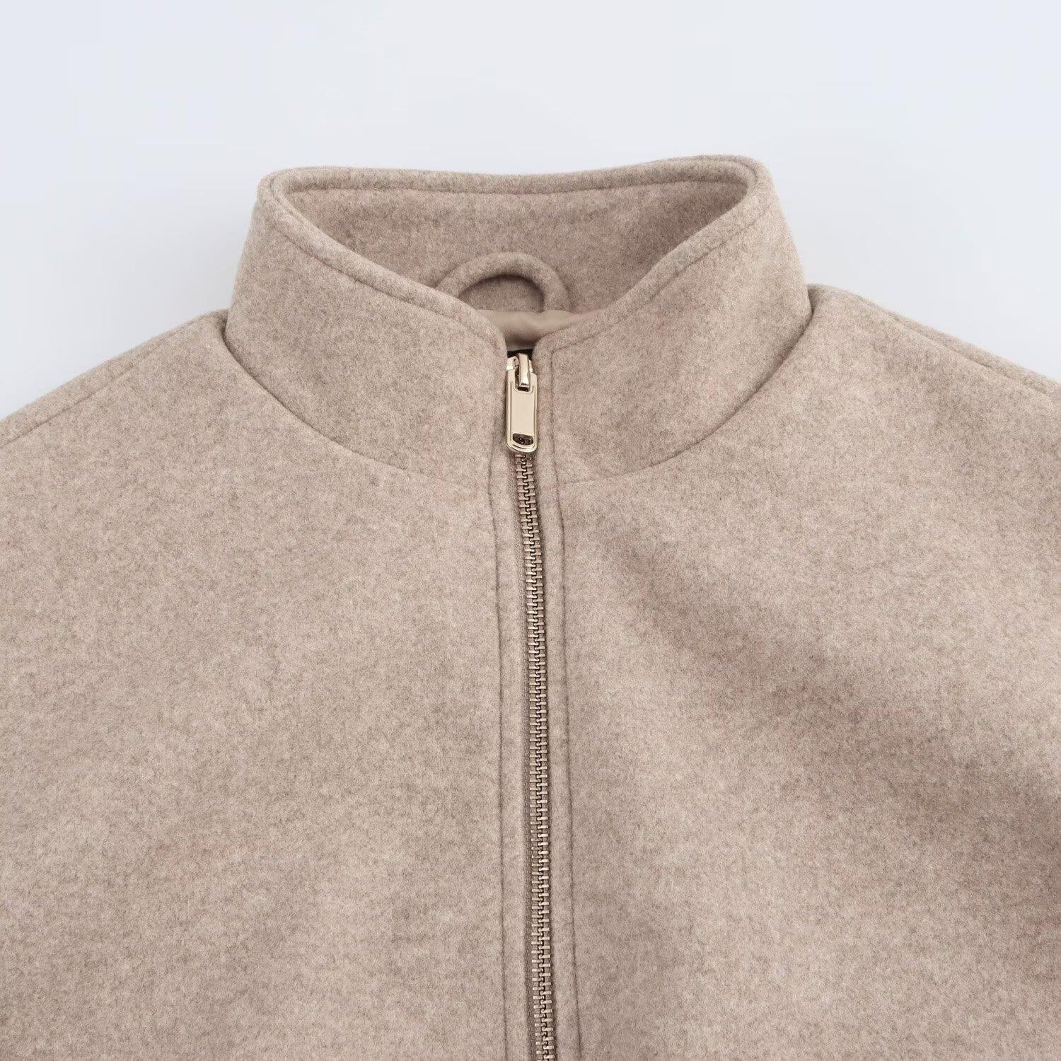 • Women Stand Collar Woolen Jacket Solid Color Metal Zipper Short Coat Long Sleeve Casual Street Style Outwear Pocket Bomber Jacket