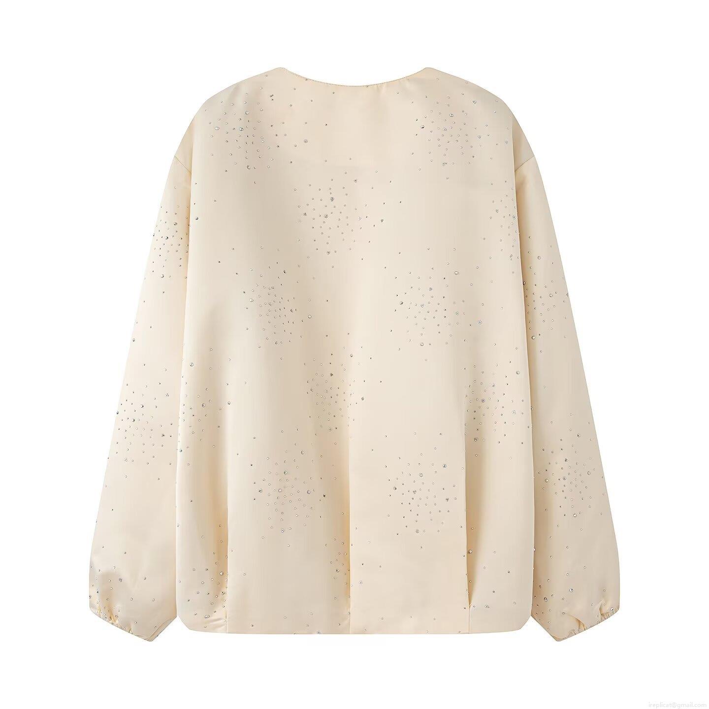 • Women Street Fashion Rhinestone Bomber Jacket Solid Color Round Neck Long Sleeve Zip Up Casual Coat With Elastic Hem Soft Polyester Outwear For Ladies