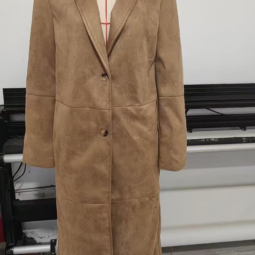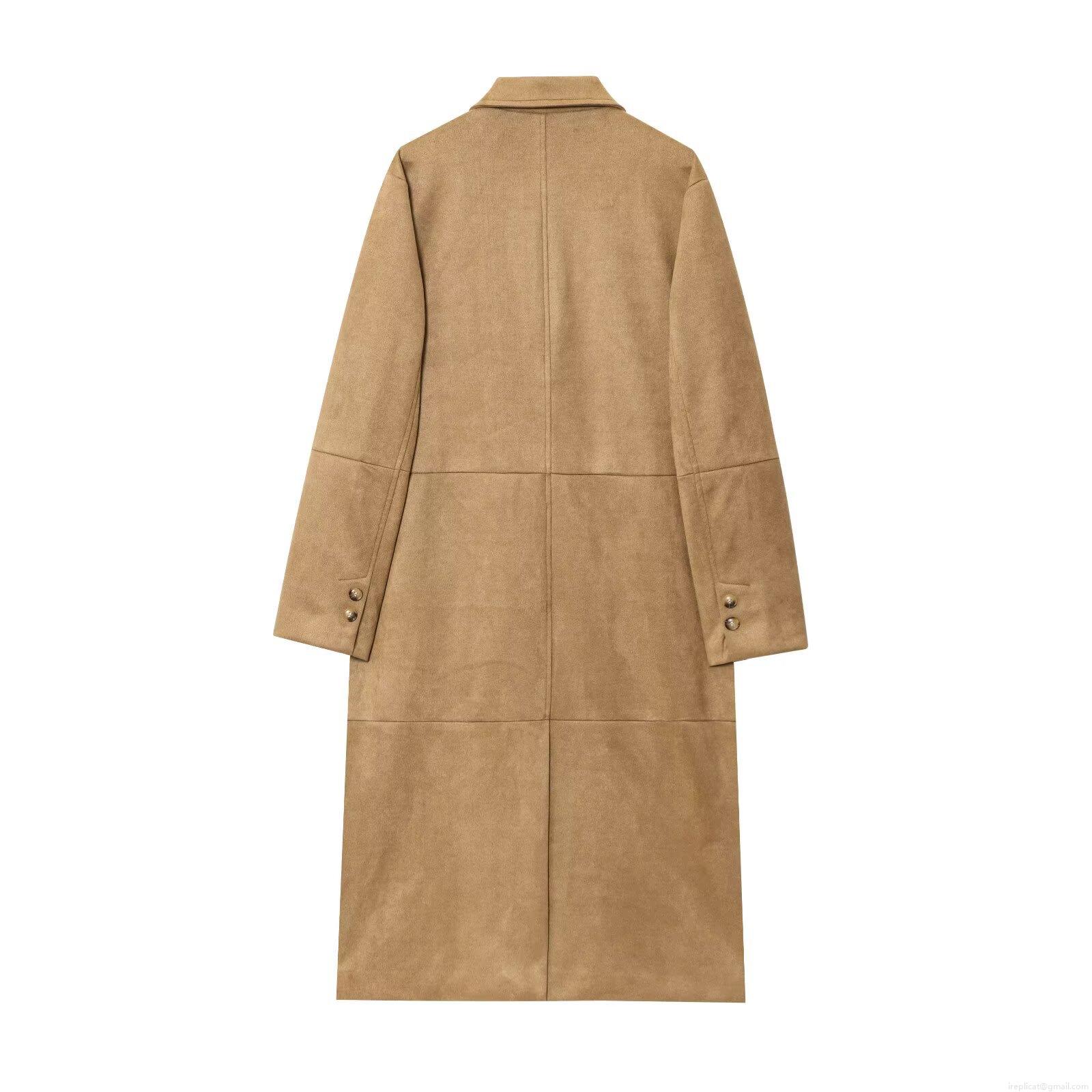 • Women Suede Fabric Notched Lapel Overcoat Double Breasted Casual Elegant Long Sleeve Loose Fit Khaki Jacket For Autumn Spring Daily Wear