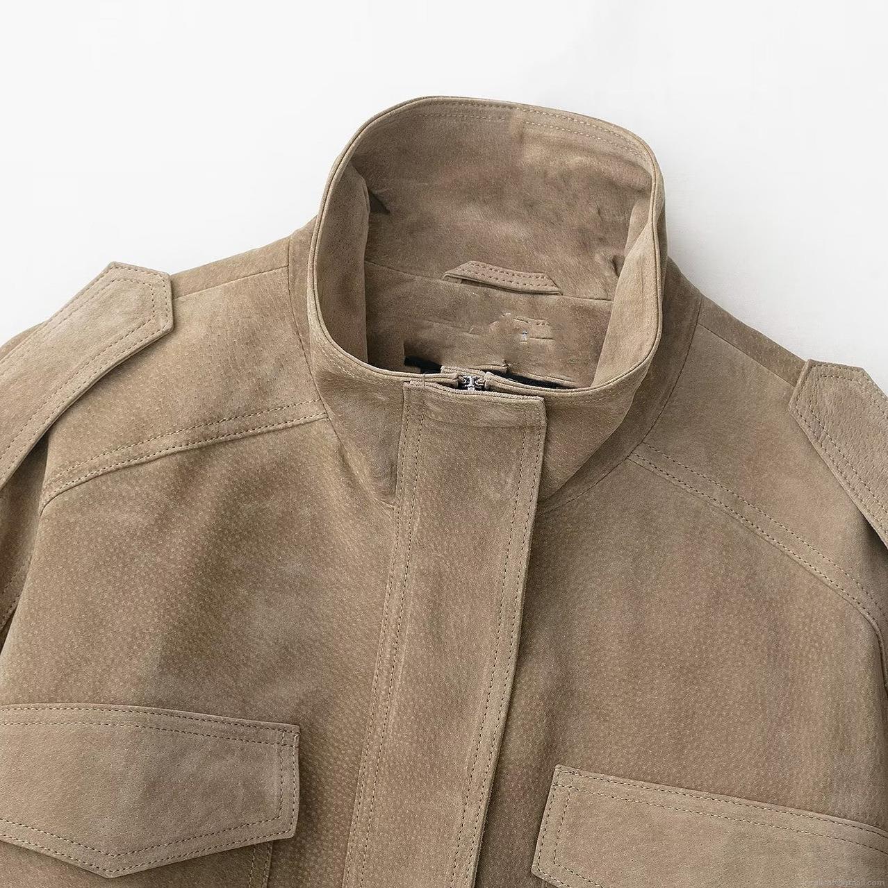 • Women Suede Jacket Stand Collar Cargo Outerwear Zip Up Faux Suede Coat Long Sleeve Utility Jacket For Fall Winter Fashion Casual Solid Color