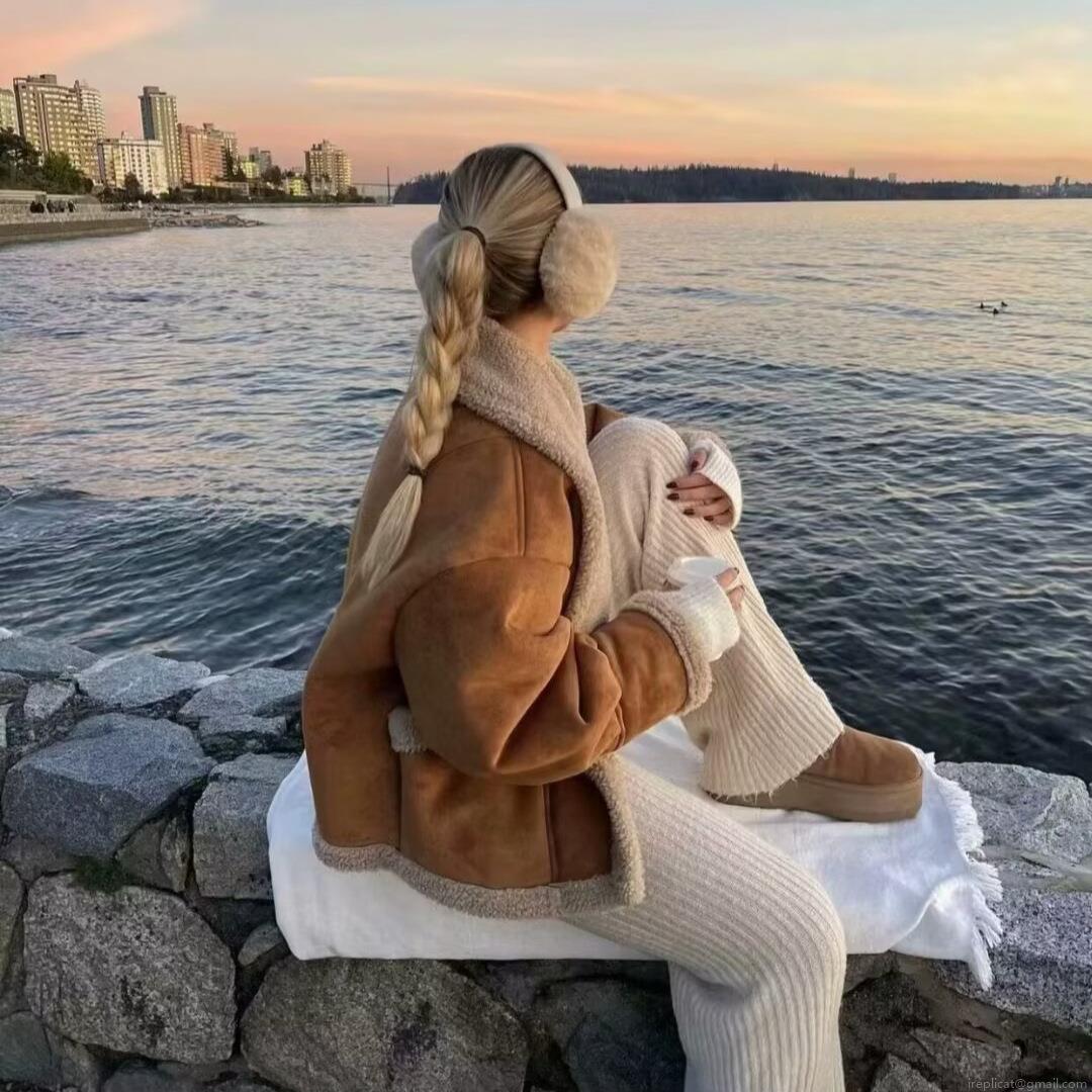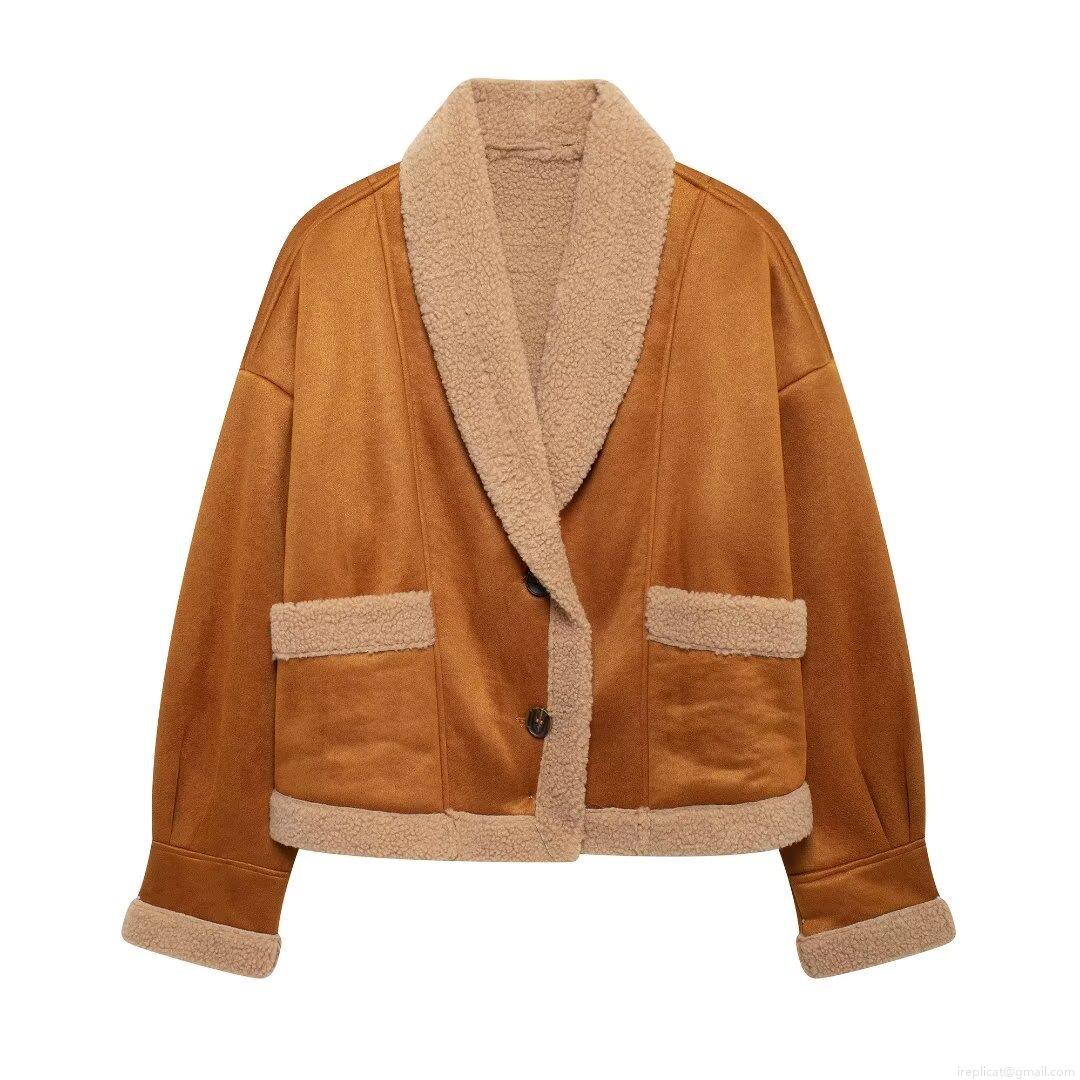 • Women Vintage Faux Suede Lamb Wool Jacket Winter Thick Warm Sherpa Trimmed Locomotive Style Loose Fit Coat Outwear