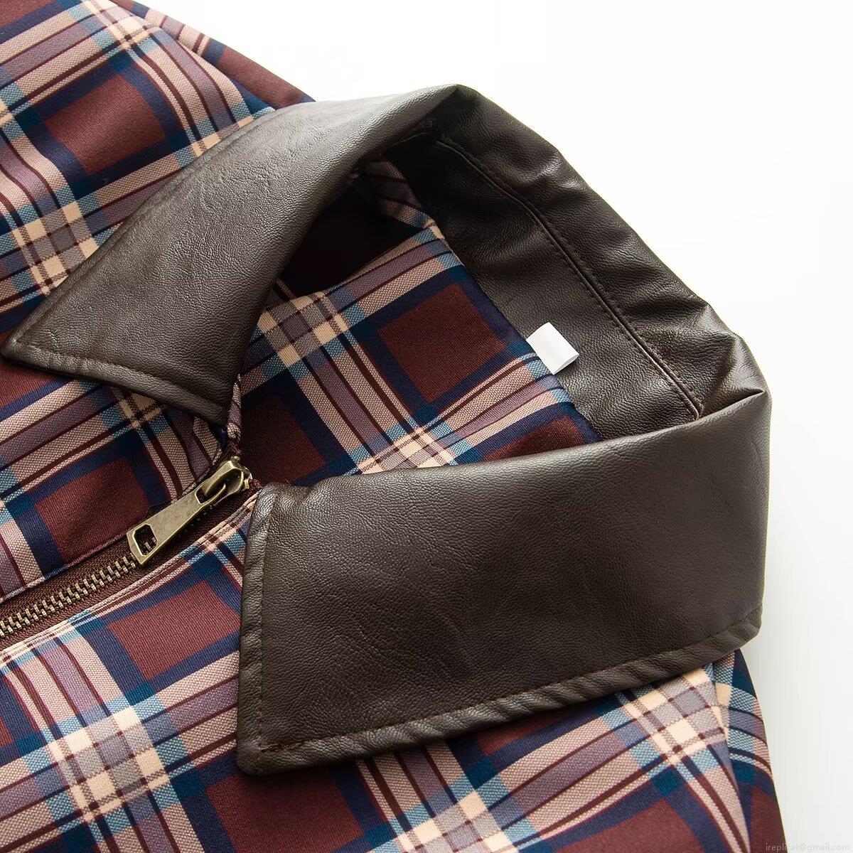 Women Vintage Plaid Jacket With Faux Leather Lapel Collar Casual Loose Long Sleeve Full Zip Bomber Coat Streetwear Burgundy Checked Outwear