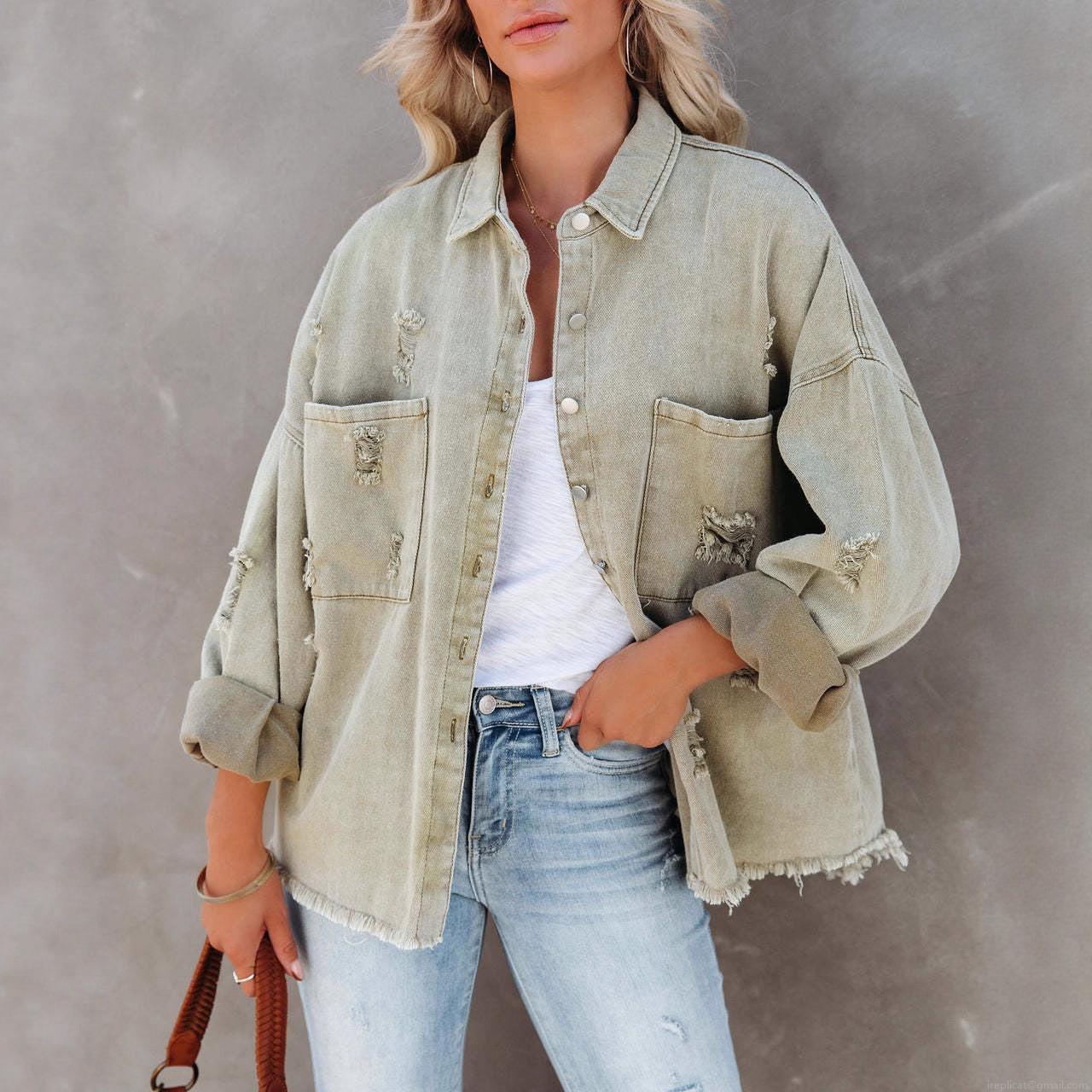 • Women Vintage Ripped Denim Jacket Oversized Distressed Jean Shirt Outerwear Long Sleeve Frayed Hem Button Down Jean Coat With Pockets