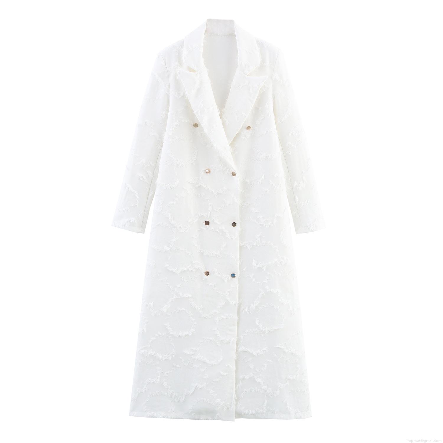 Women White Extra Long Trench Coat With 3D Texture Tassel Fabric Double Breasted Blazer Collar Long Sleeve Outerwear For Autumn Winter Office Lady