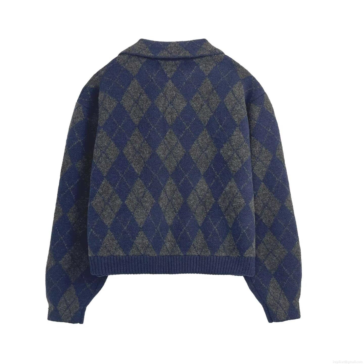 • Women's Argyle Knit Jacket Zipper Up Cardigan Lapel Collar Long Sleeve Contrast Color Patchwork Outwear For Autumn Winter Casual Streetwear