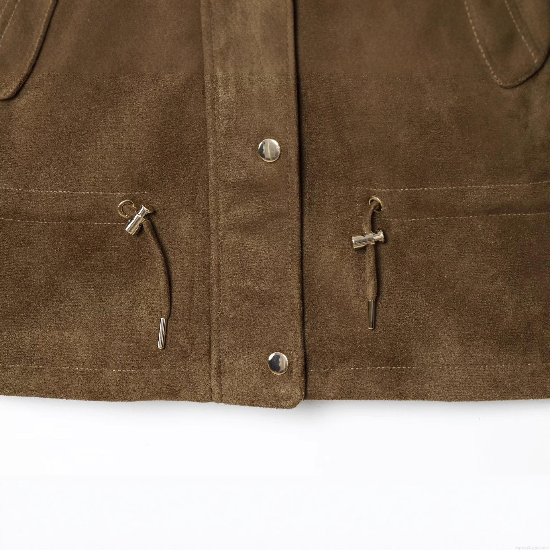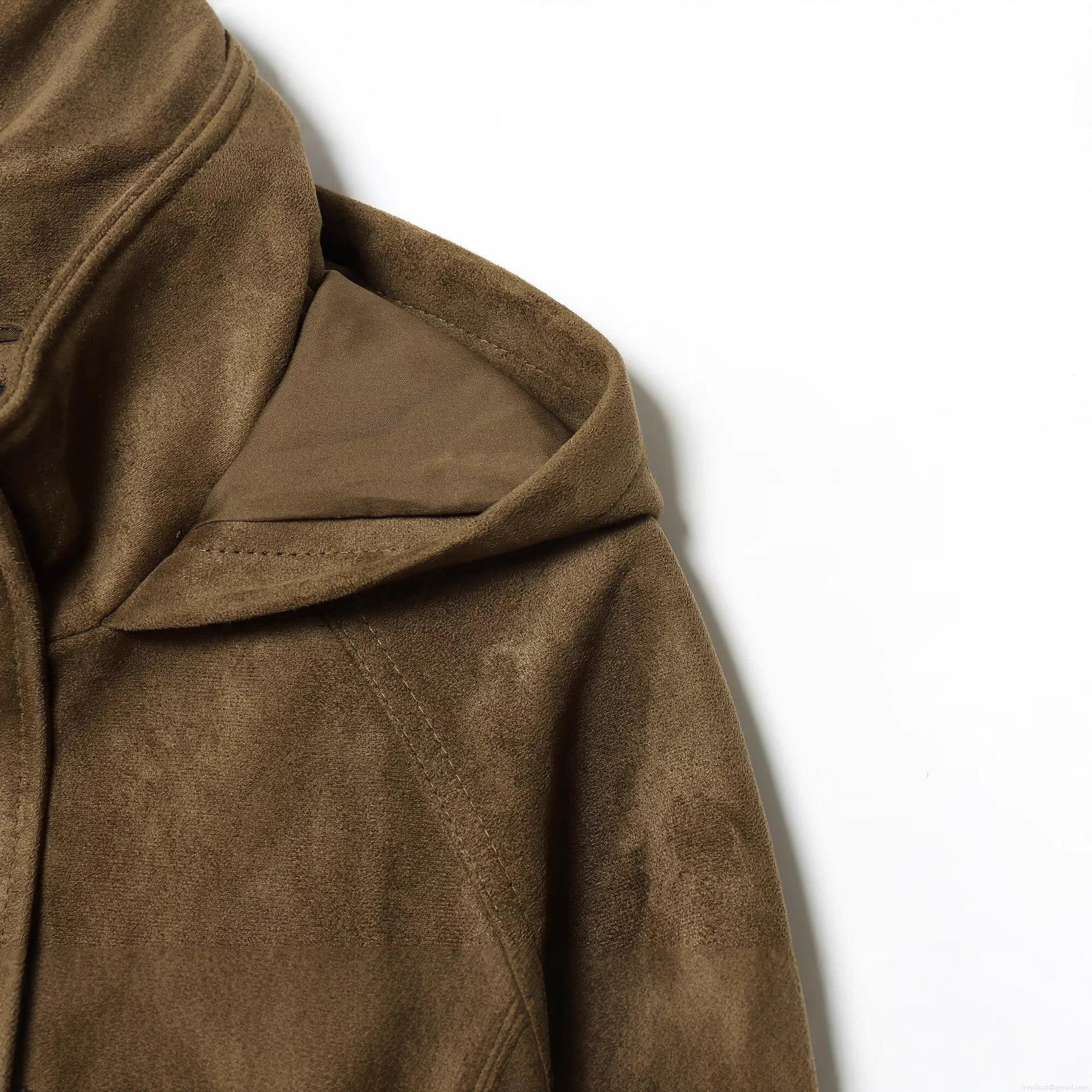 • Women's Autumn Winter Faux Suede Hooded Jacket Waist Drawstring Solid Color Long Sleeve Casual Outerwear Coat With Metal Buttons