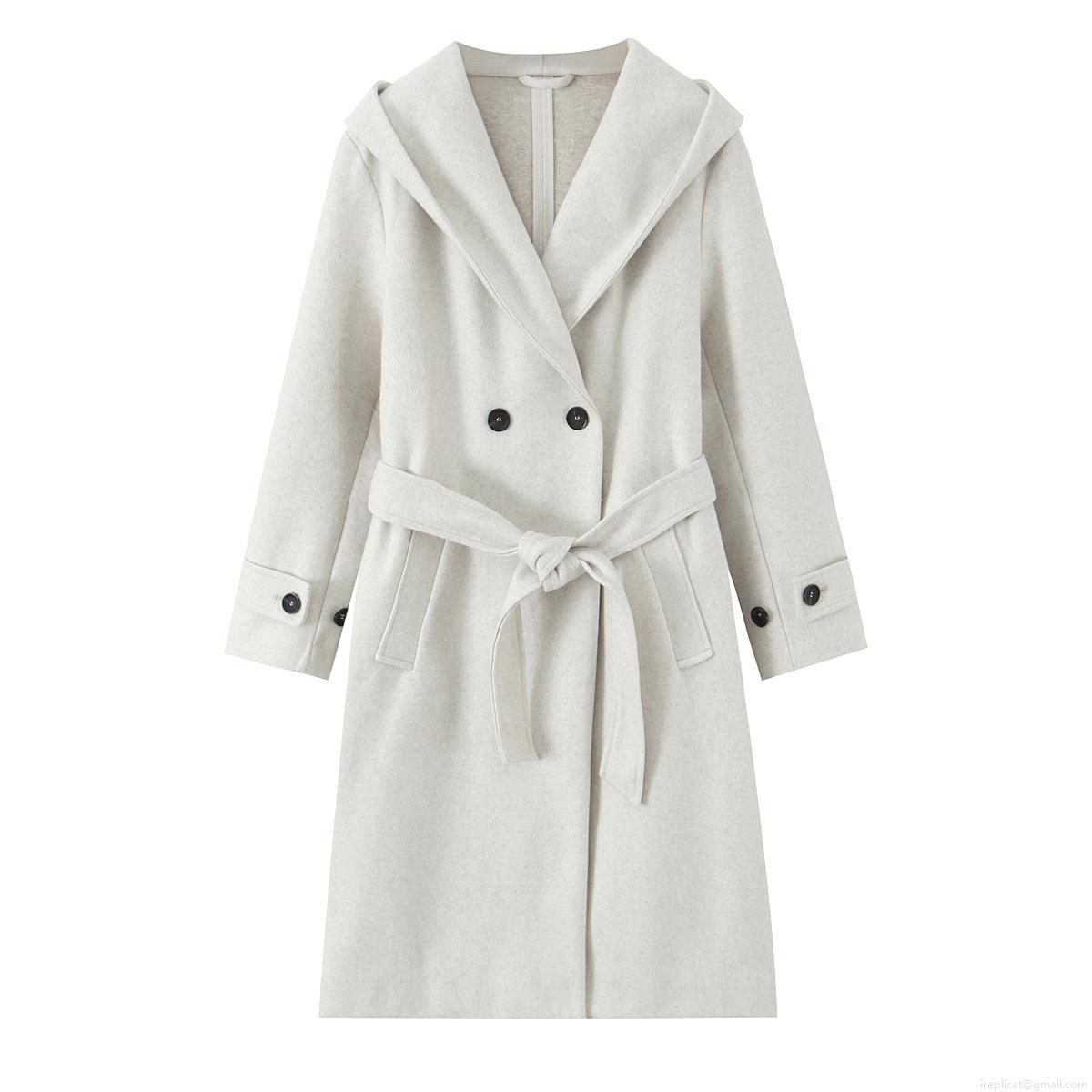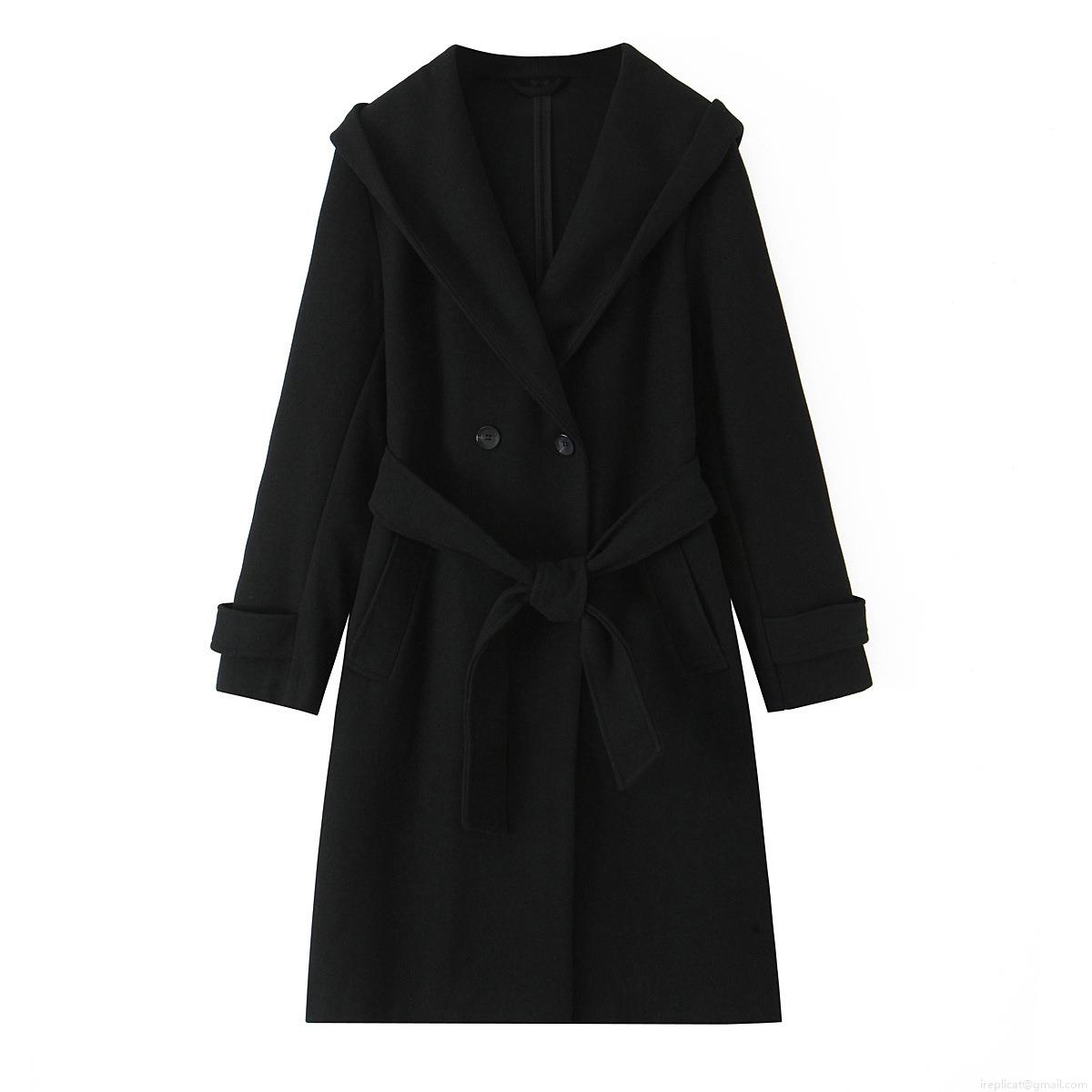 • Women's Autumn Winter Hooded Woolen Coat With Belt Double Breasted Long Trench Coat Elegant Overcoat Solid Color Outerwear For Women