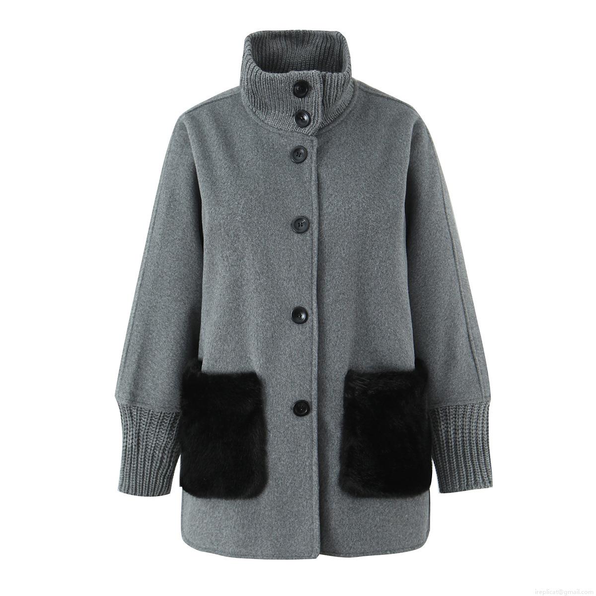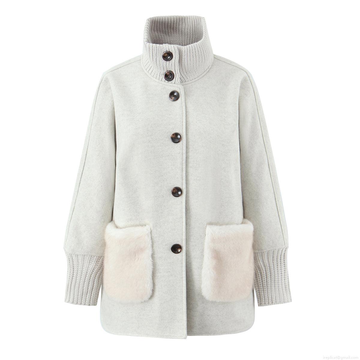 • Women's Autumn Winter Mid-Length Outerwear Stand Collar Knit Stitched Coat with Faux Fur Pockets Single Breasted Loose Casual Warm Jacket Women