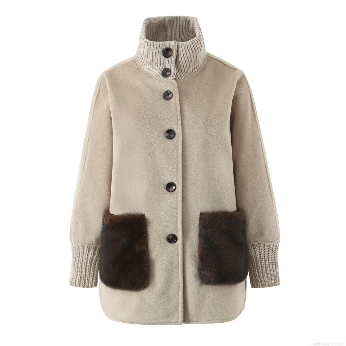 Women's Autumn Winter Mid-Length Outerwear Stand Collar Knit Stitched Coat with Faux Fur Pockets Single Breasted Loose Casual Warm Jacket Women