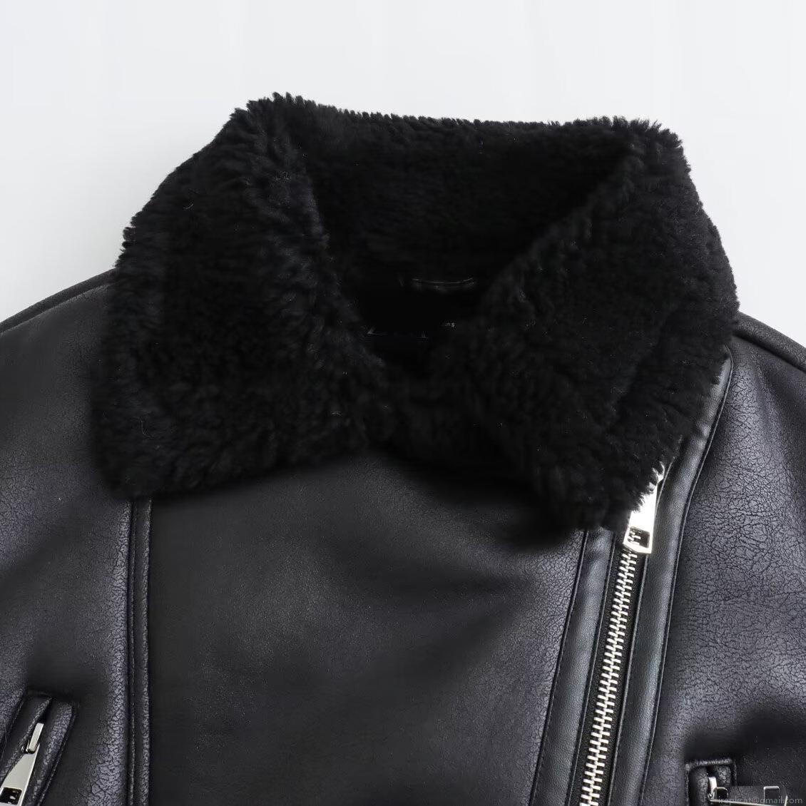 • Women's Biker Jacket Faux Leather Shearling Lined Thick Moto Style Zipper Decor Lapel Warm Casual Winter Streetwear Fashion Outwear