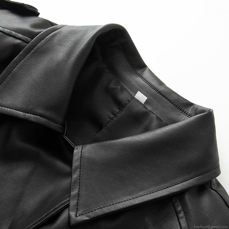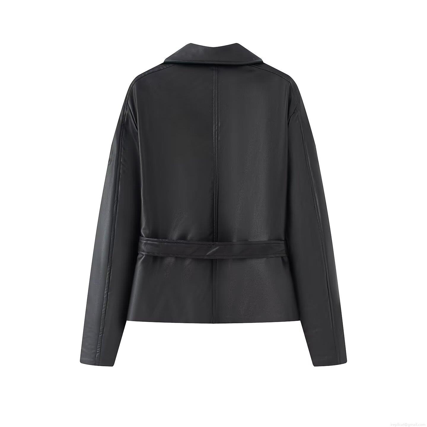Women's Black PU Leather Jacket With Belt Long Sleeve Notched Lapel Button Down Short Trench Coat Autumn Winter Solid Color Slim Biker Outerwear For Ladies