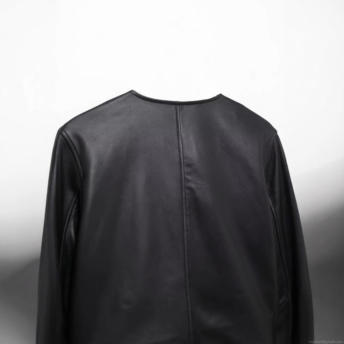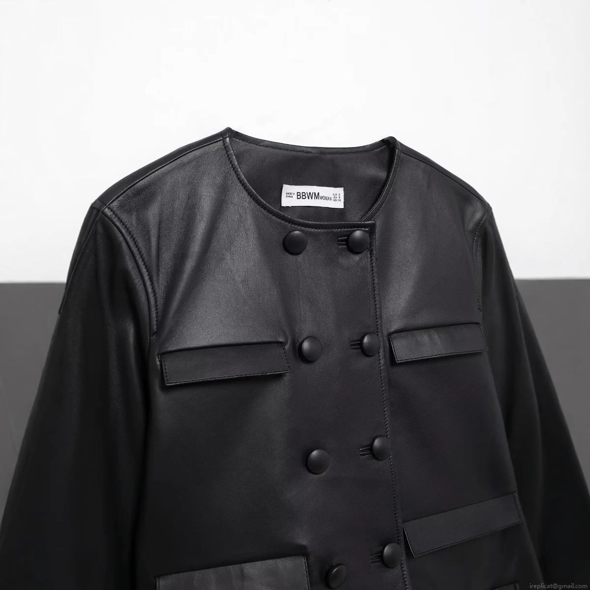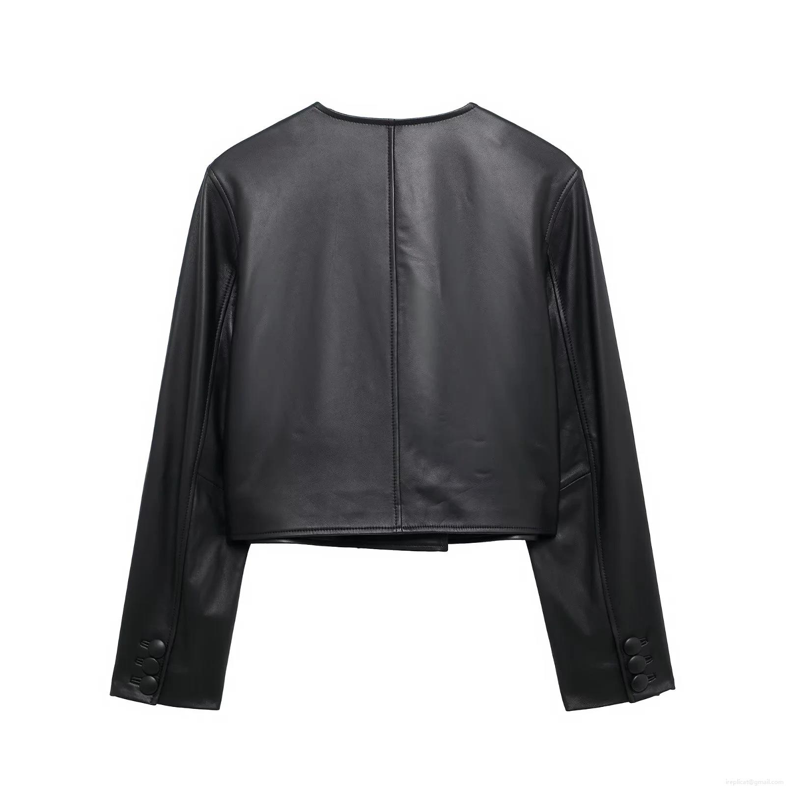 • Women's Black Short PU Leather Jacket Double Breasted Round Neck Long Sleeve Faux Leather Coat For Autumn Casual Streetwear Chic Women's Outerwear