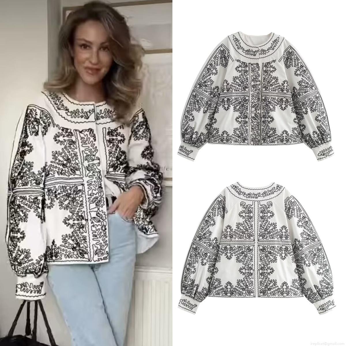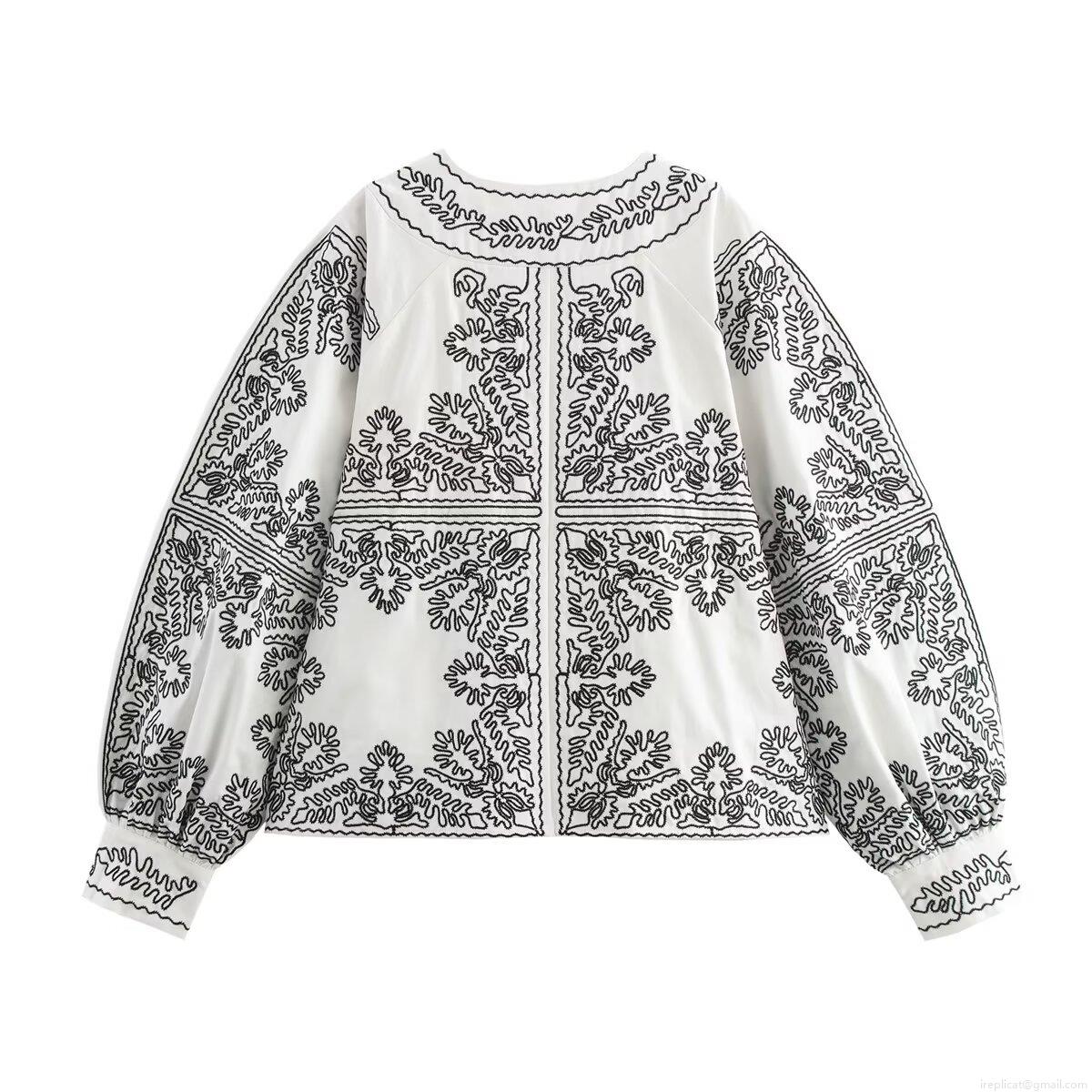 • Women's Bohemian Ethnic Embroidered Jacket 100% Cotton Round Neck Long Sleeve White Black Floral Geometric Embroidery Button Down Short Coat