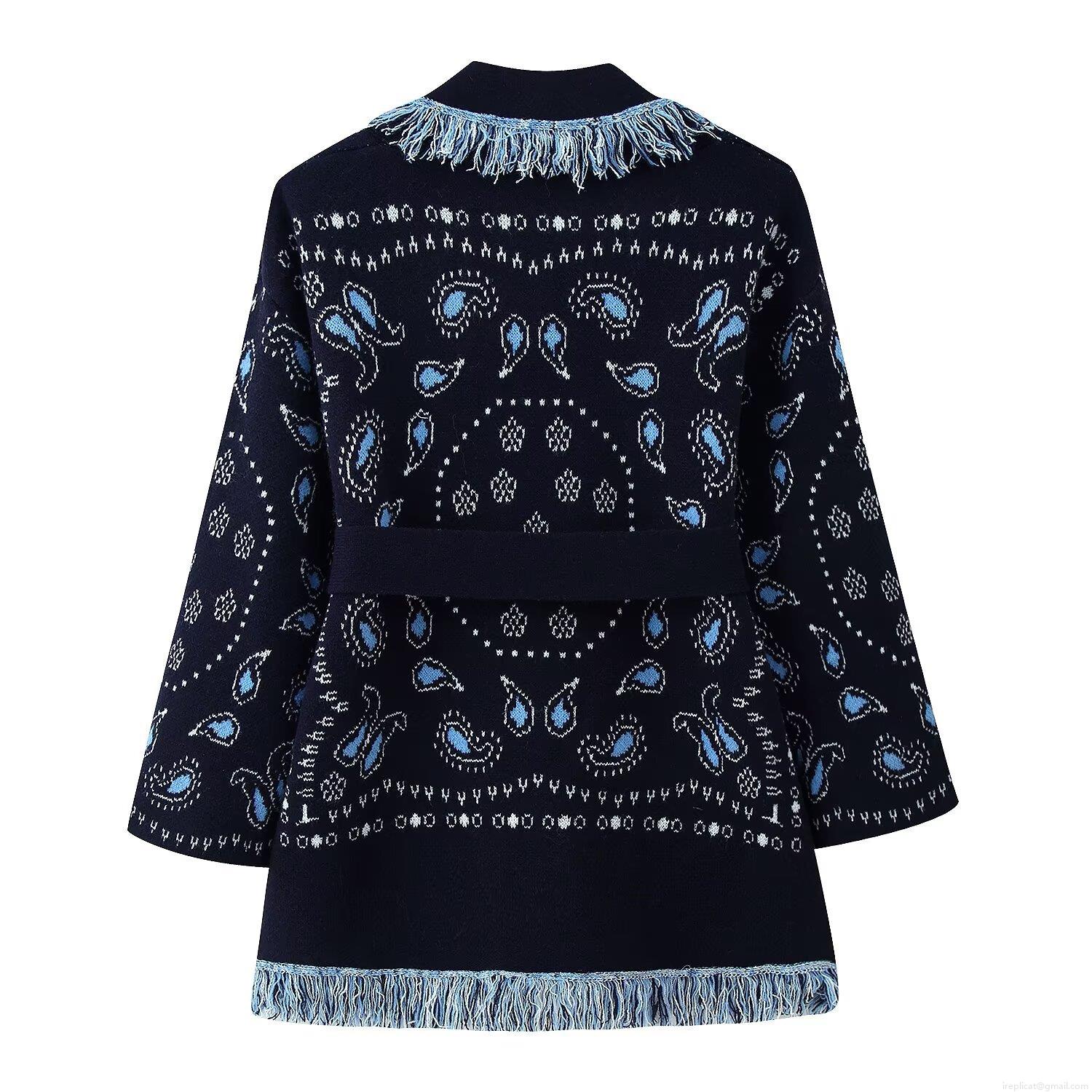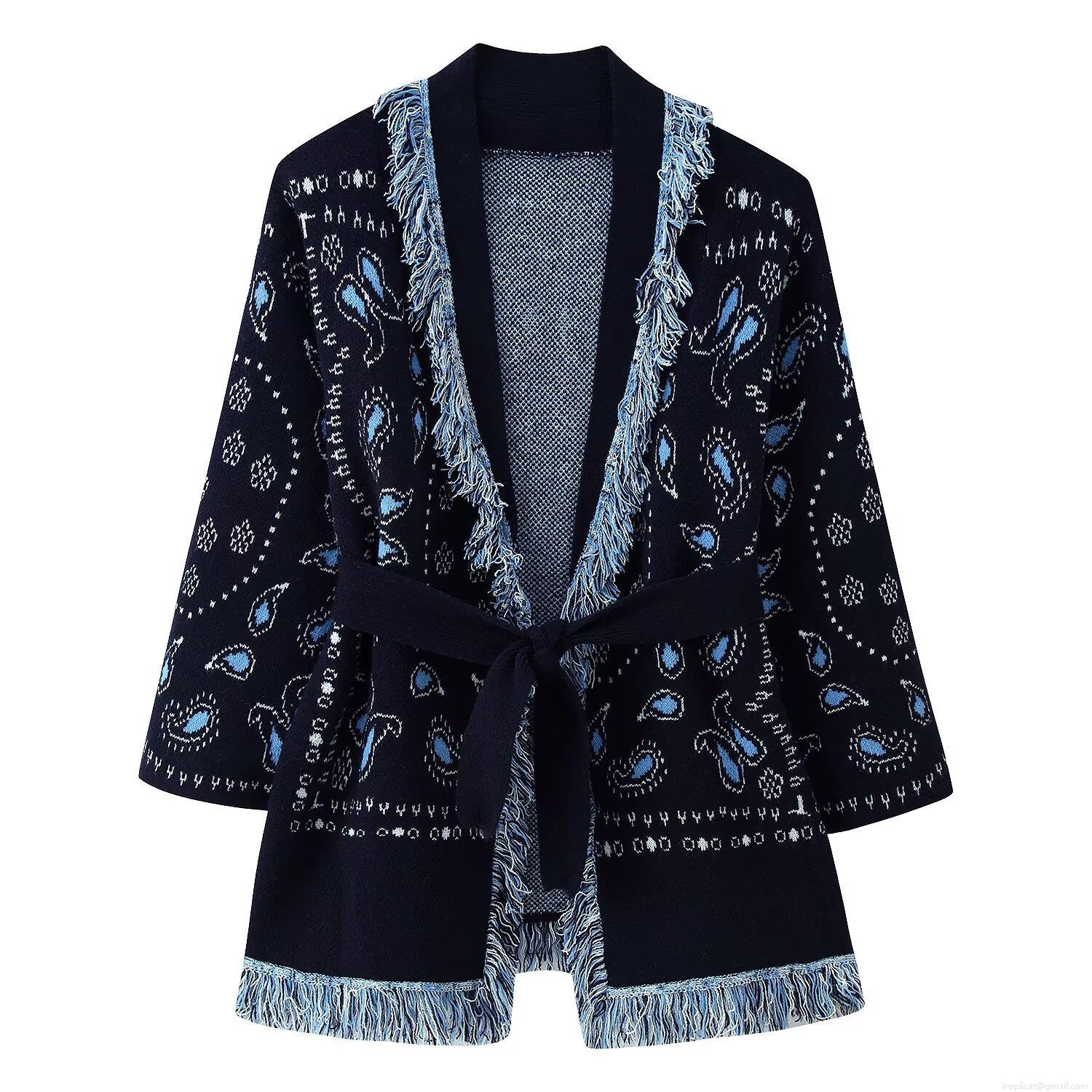 • Women's Bohemian Paisley Knitted Cardigan Jacket With Tassel Trim And Tie-up Belt Navy Blue Long Sleeve Open Front Knitted Sweater Coat For Vacation Daily Wear