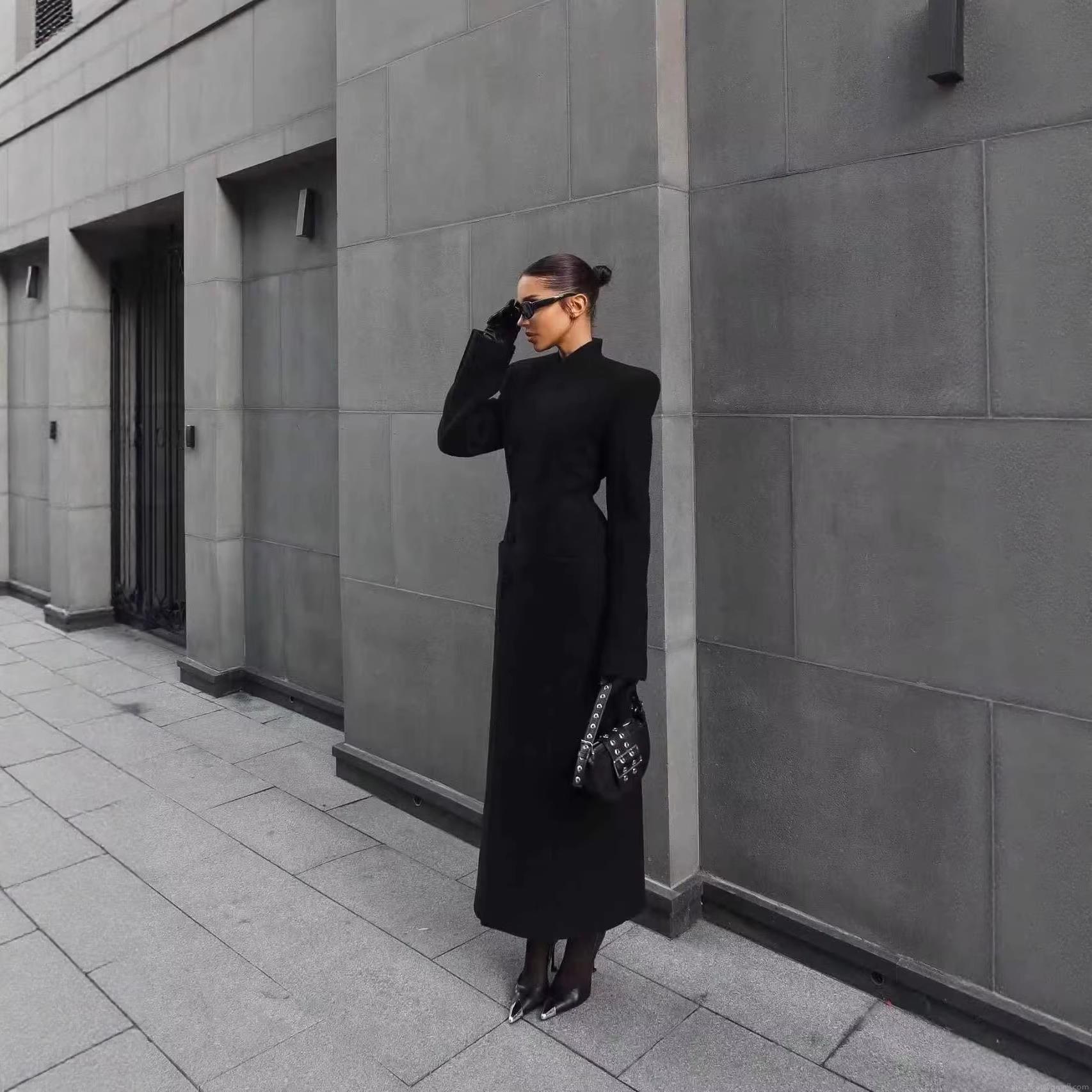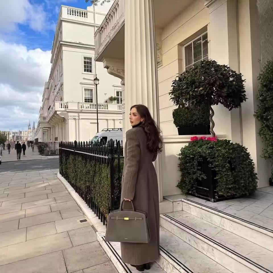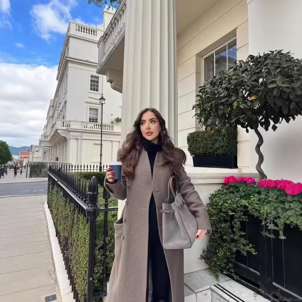 • Women's British Style Long Woolen Coat Single Breasted V-Neck Padded Shoulder Elegant Solid Color Polyester Blend Overcoat Outerwear For Autumn Winter