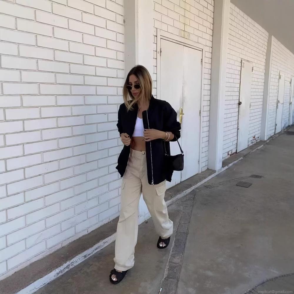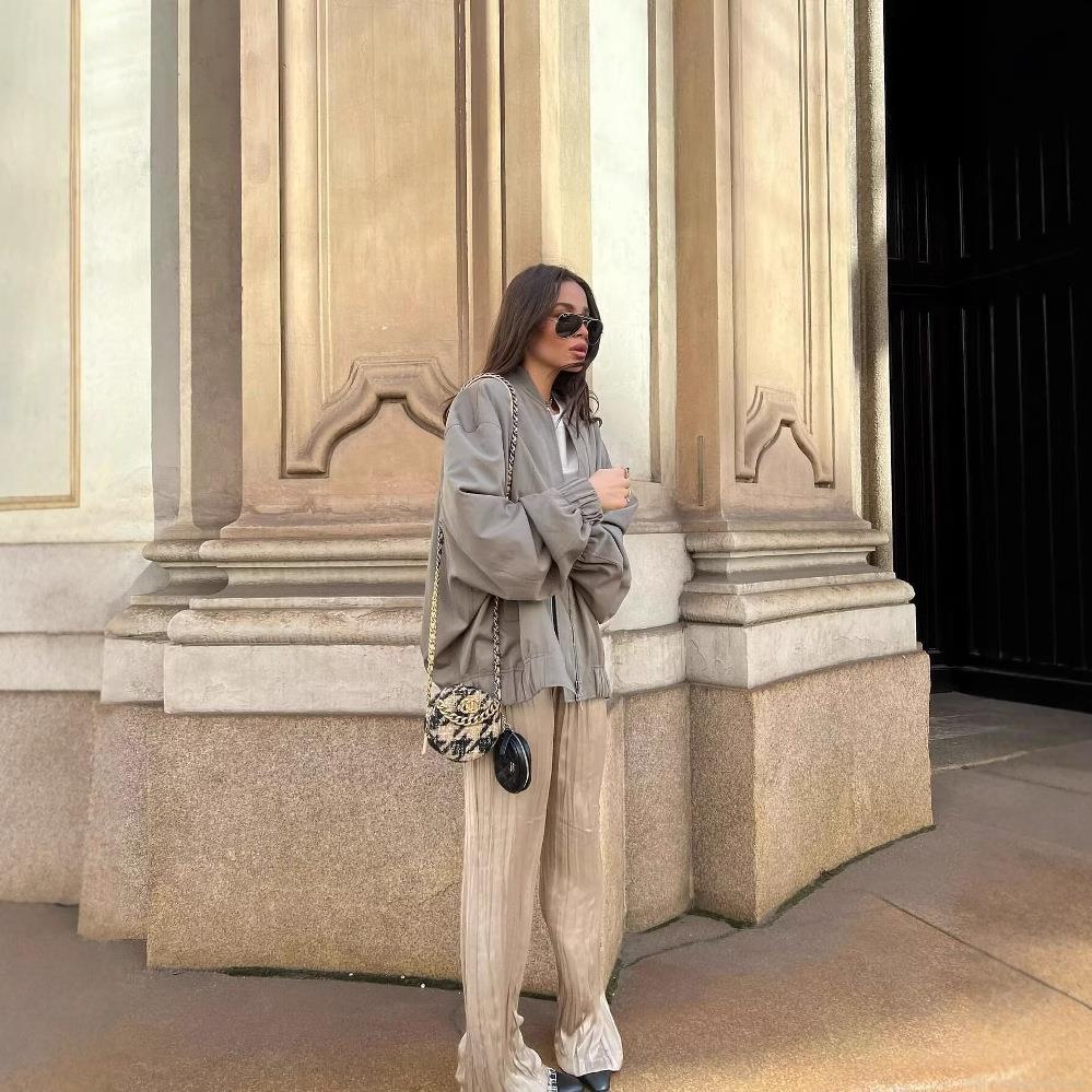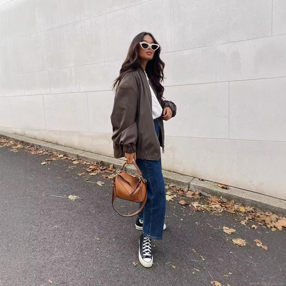 • Women's Casual Bomber Jacket 100% Polyester Zip Up Oversized Flight Jacket Ribbed Trim Long Sleeve Solid Color Streetwear Outerwear Coat