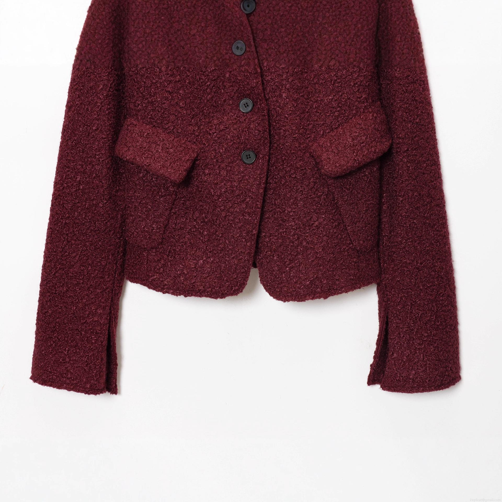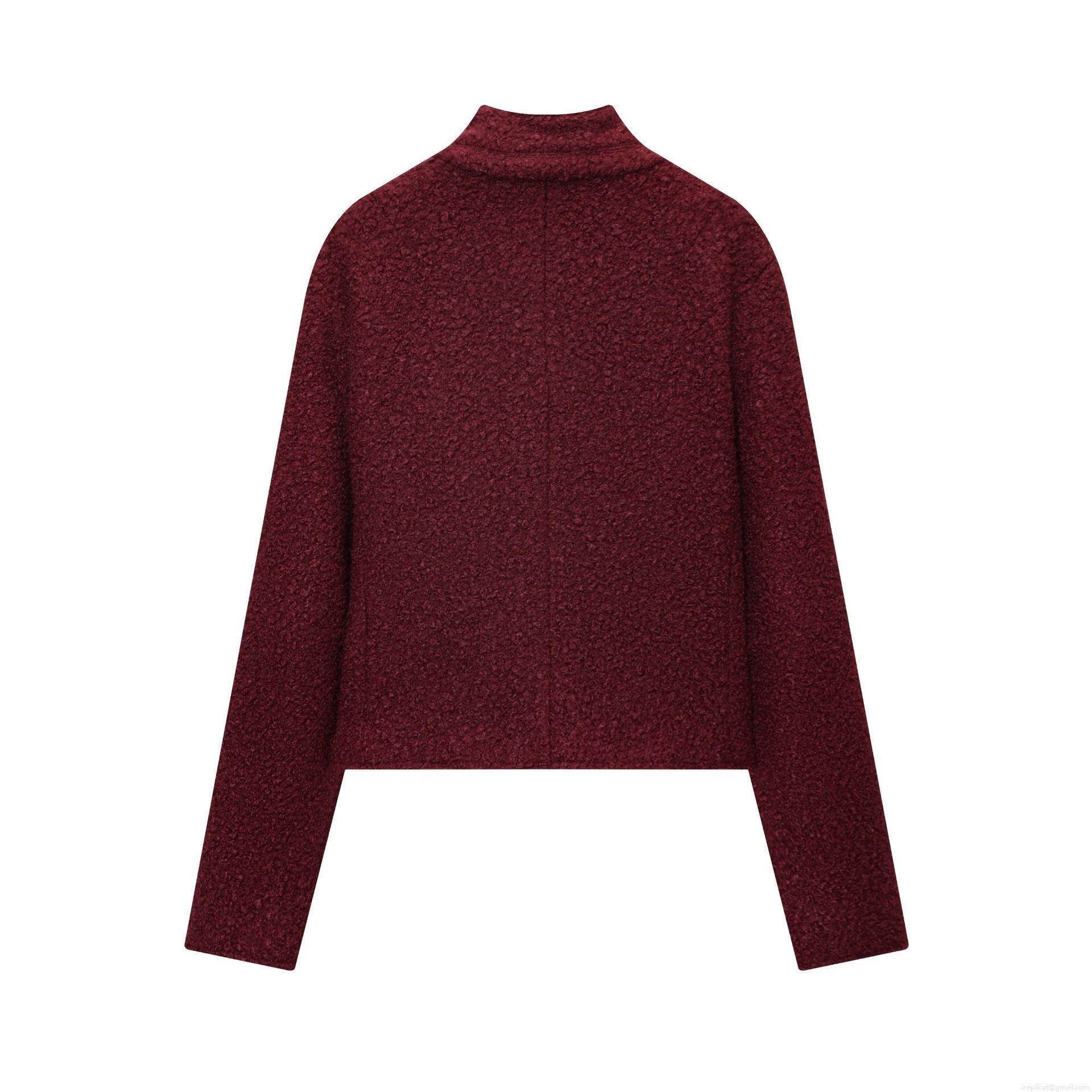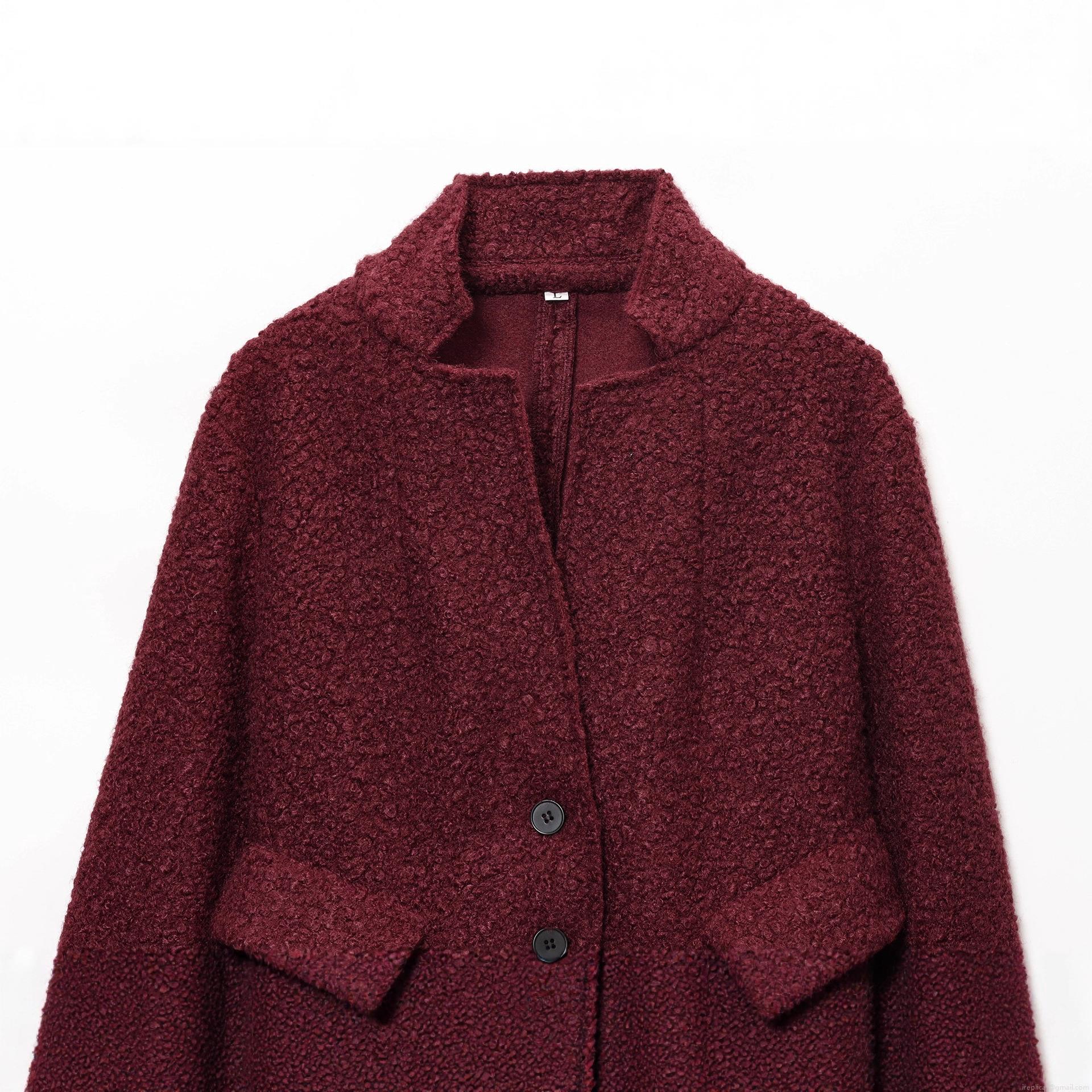 • Women's Casual Bouclé Jacket Solid Wine Red Stand Collar Long Sleeve Coat With Pockets Single Breasted Polyester Outerwear For Autumn Winter
