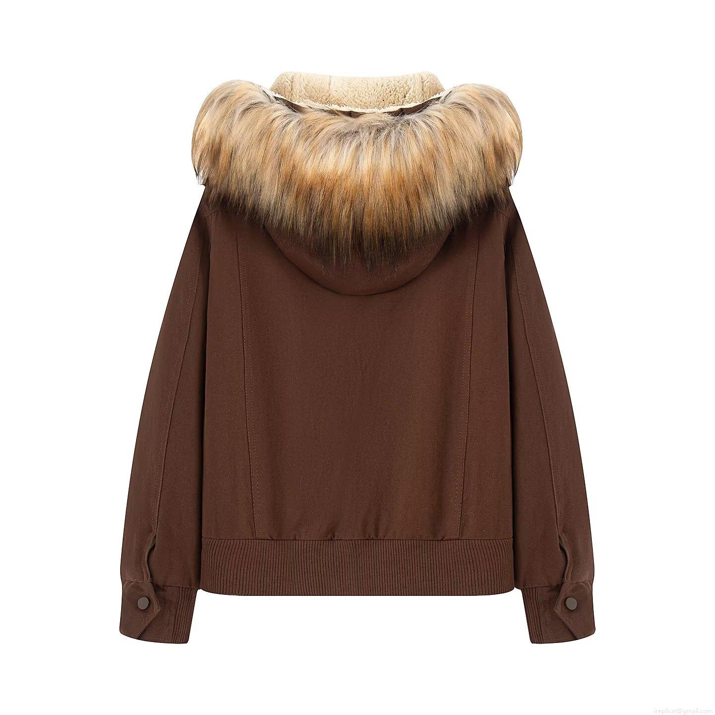 Solid Color, Zipper, Buttons, Hood, Ribbed Cuffs, Large Fur Collar, Work Pockets