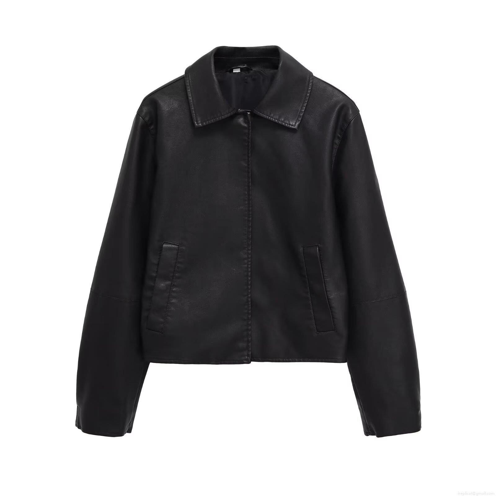 Women's Casual Faux Leather Jacket Fashion Lapel Long Sleeve Solid Black Zip Up Short Moto Biker Coat Outerwear for Women Autumn Winter Daily Streetwear