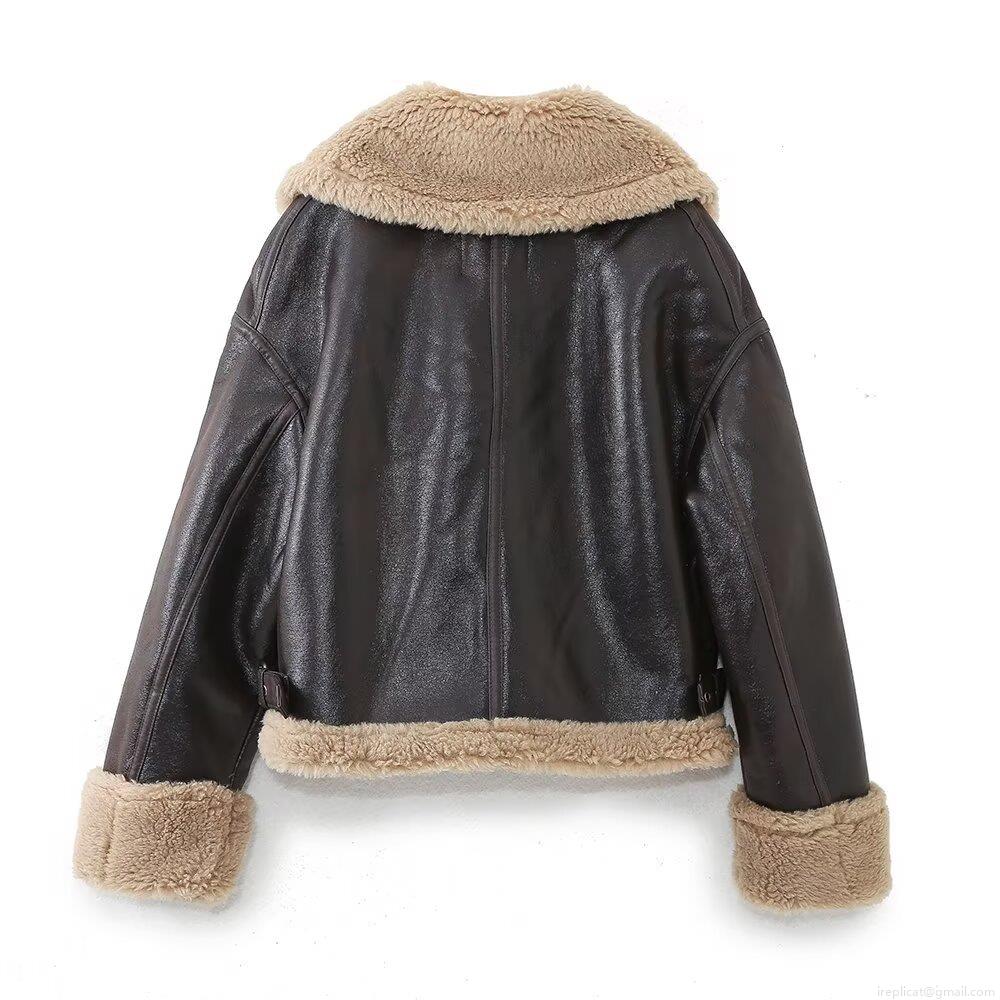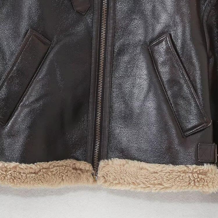 • Women's Casual Faux Leather Shearling Moto Jacket Oversized Warm Faux Fur Lined Autumn Winter Outerwear Coat Lapel Zipper Solid Dark Coffee Brown Jacket