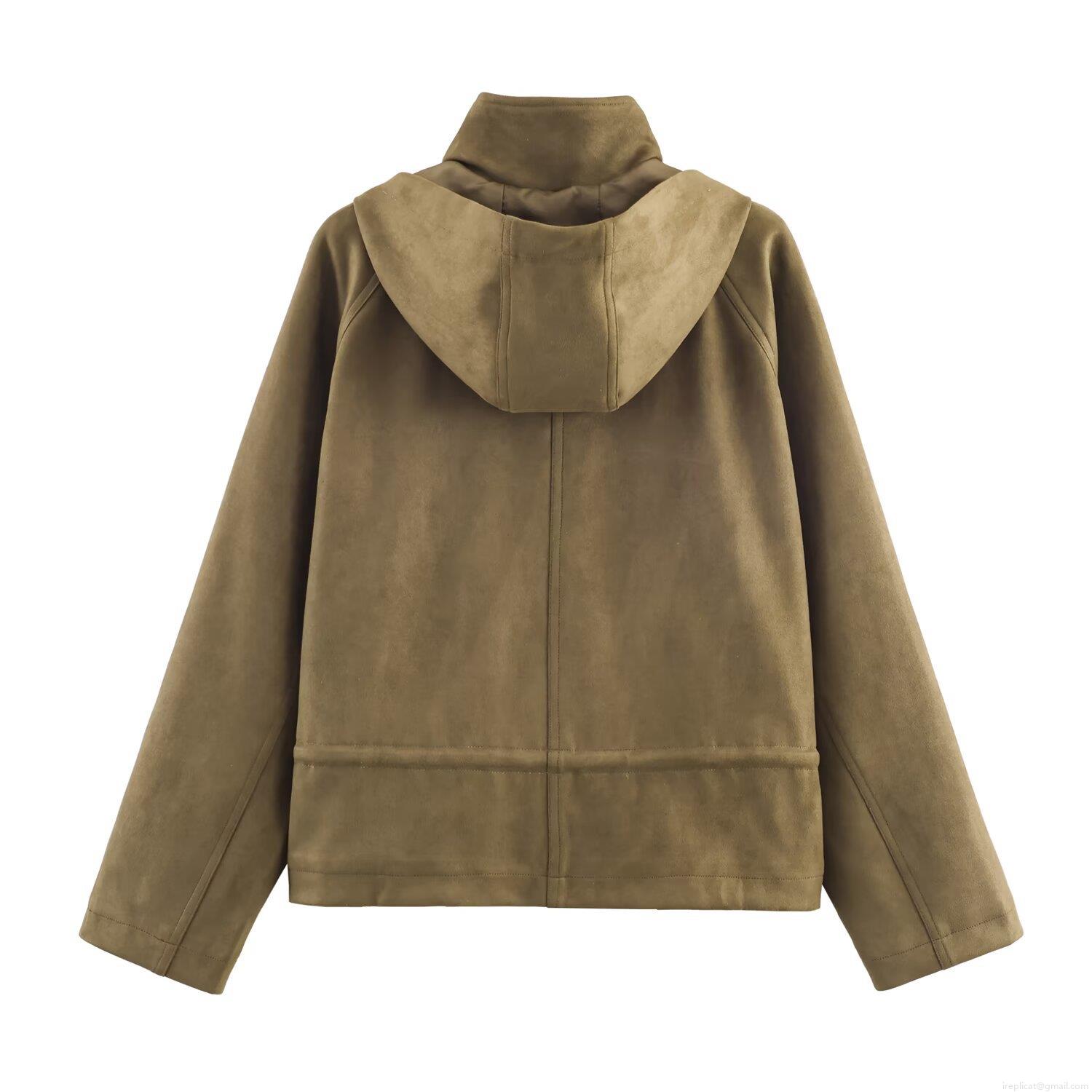 Women's Casual Faux Suede Hooded Jacket Solid Color Long Sleeve Outerwear With Drawstring Hem And Pockets Zip Up Jackets For Women Streetwear