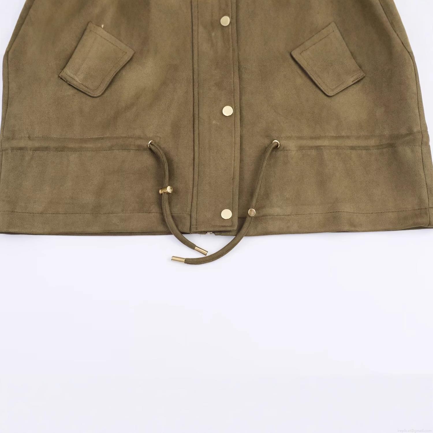 Solid Color, Pocket, Metal Snap, Drawstring Hem, Suede Effect