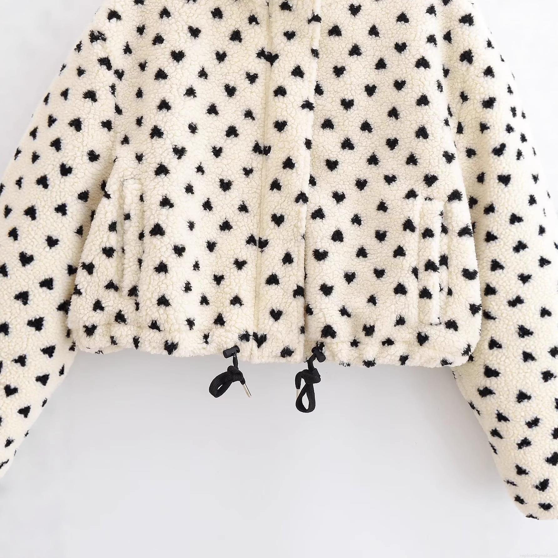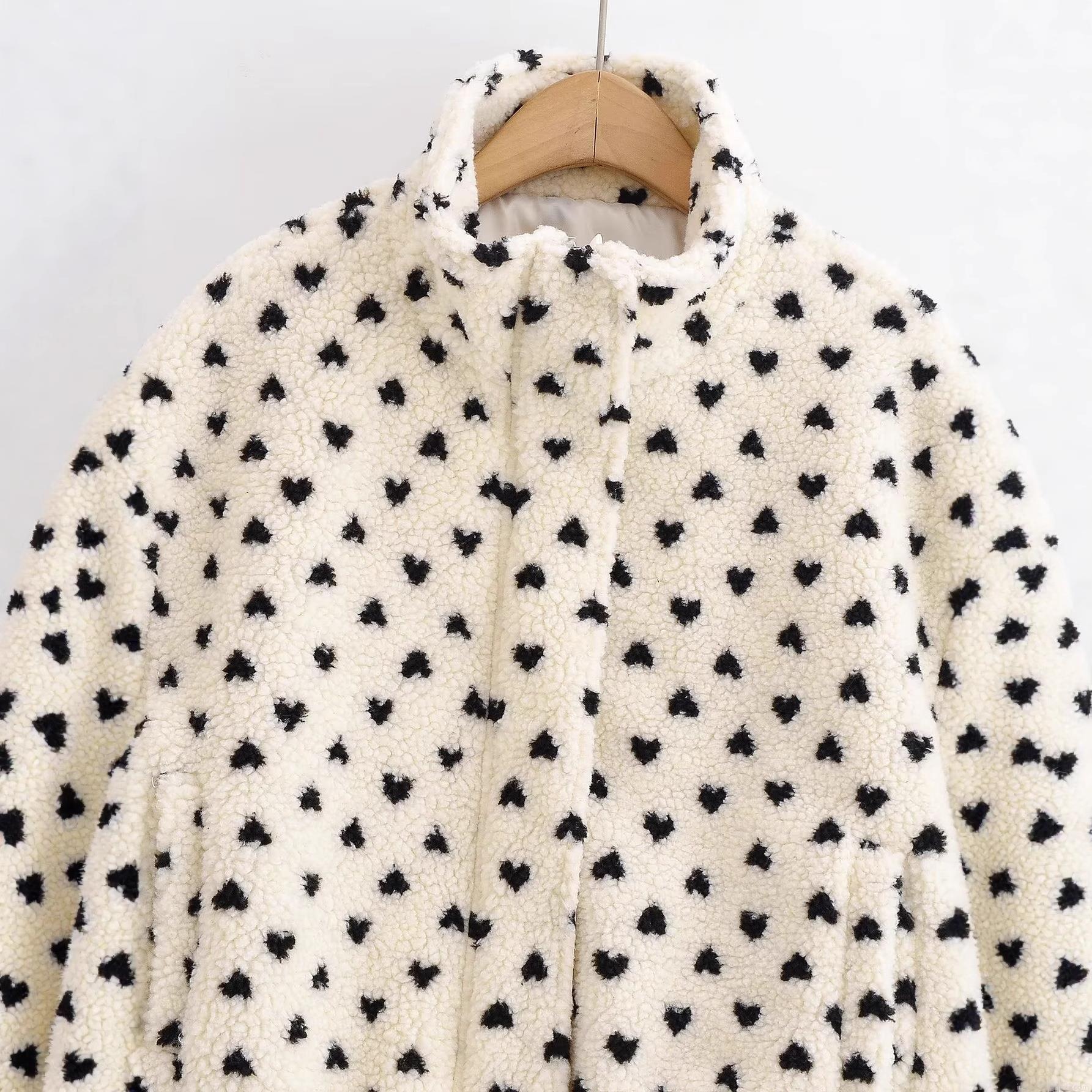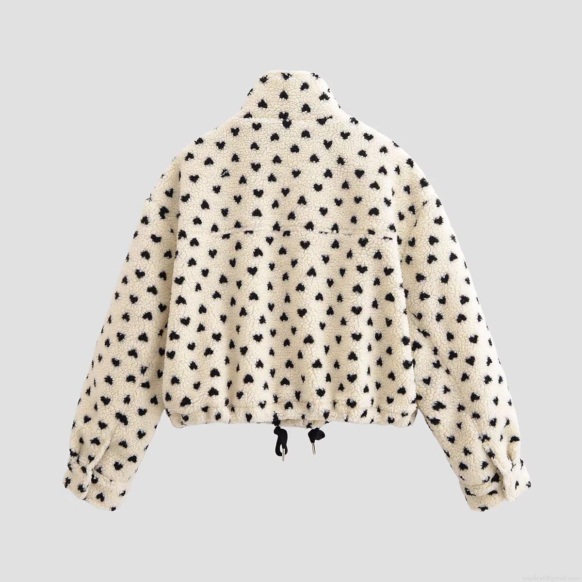 Women's Casual Heart Print Sherpa Fleece Jacket Short Stand Collar Zip Up Coat With Adjustable Drawstring Hem Warm Fuzzy Outerwear