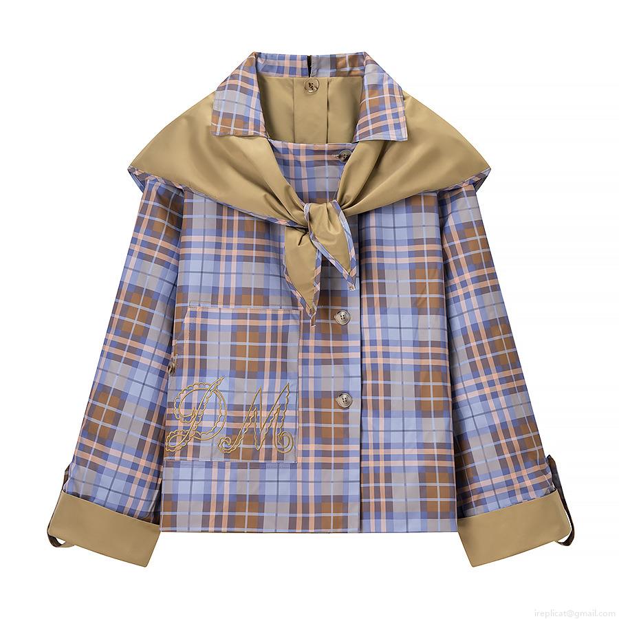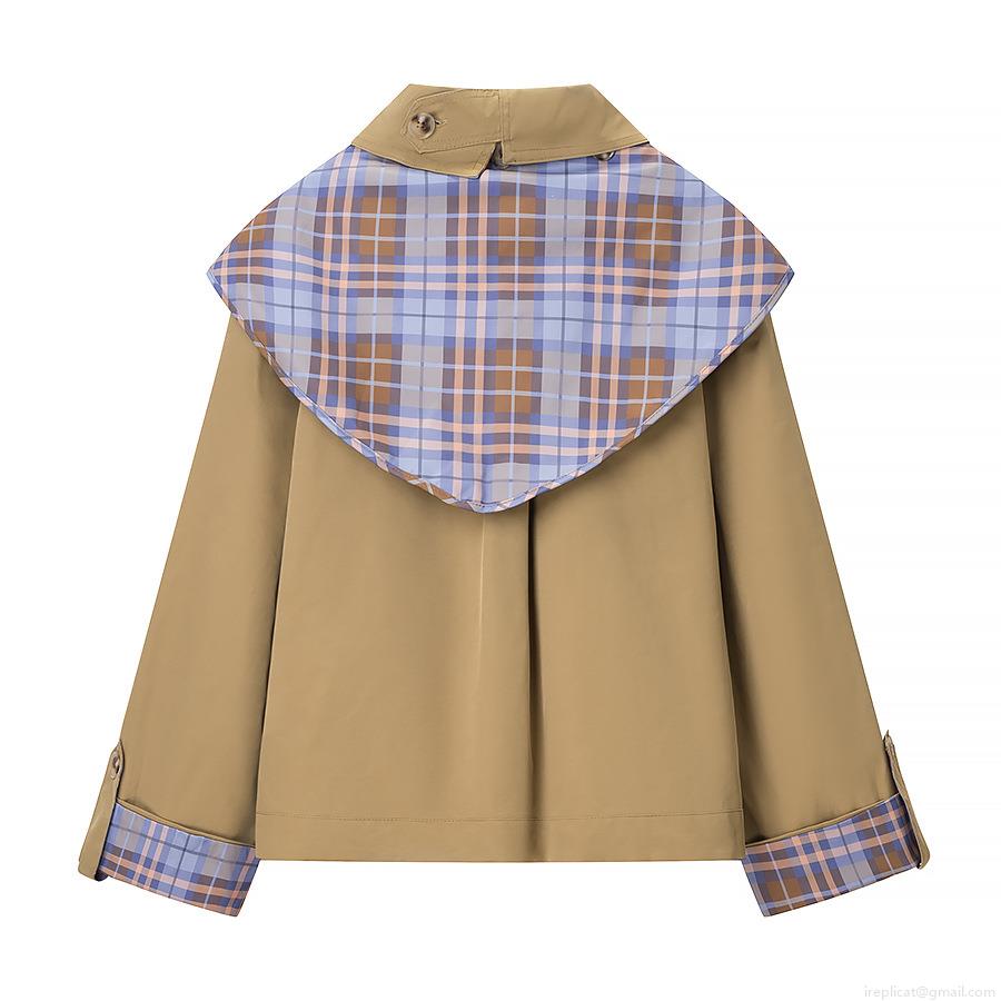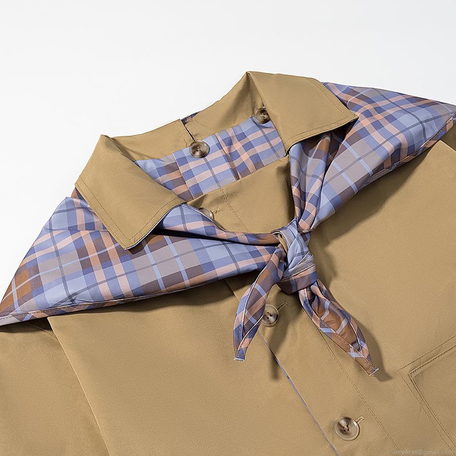 Women's Casual Khaki Jacket With Plaid Scarf Collar And Cuffs Elegant Embroidery Zip Up Short Windbreaker Coat For Lady Autumn Daily Wear
