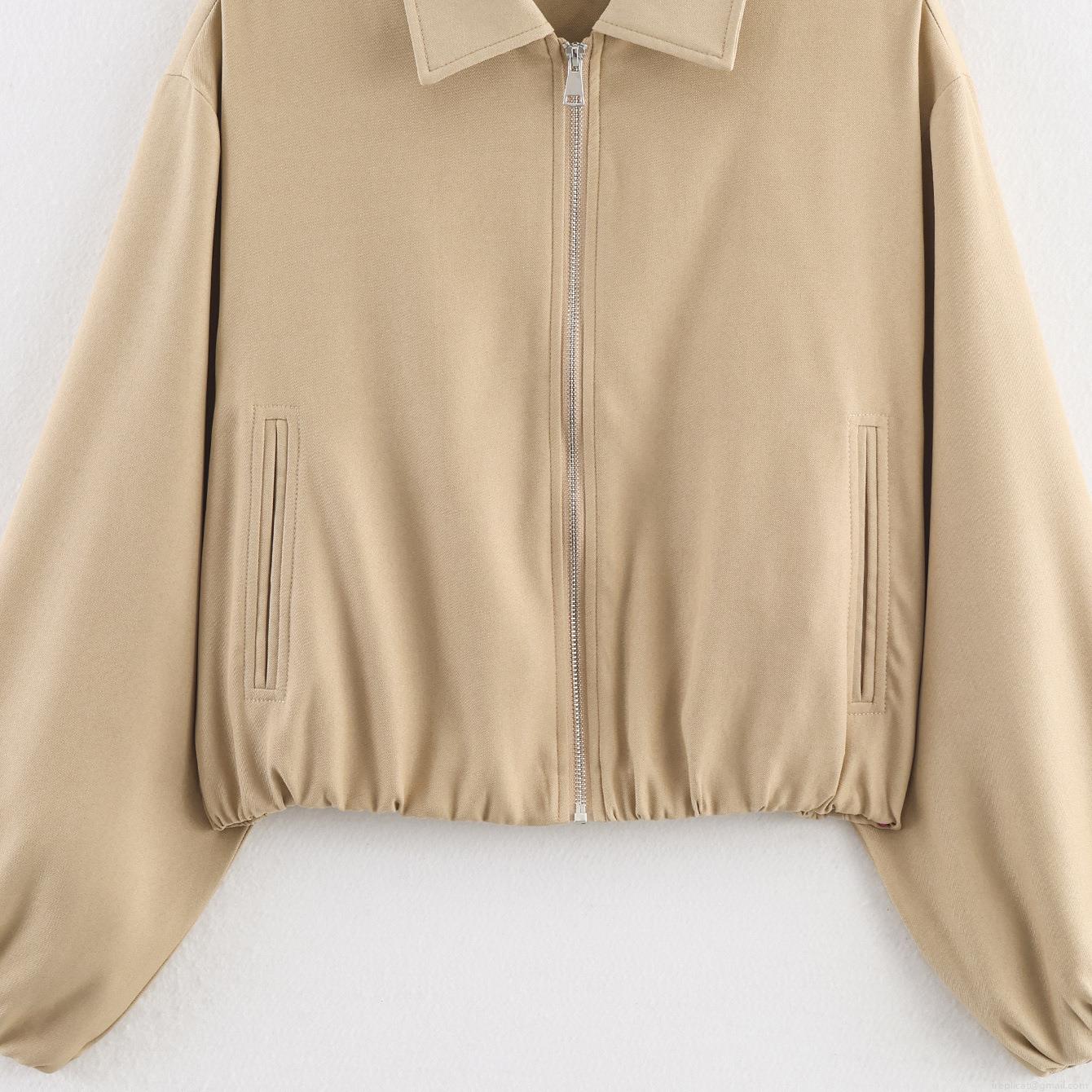 Women's Casual Loose Zipper Jacket 100% Polyester Woven Solid Color Lapel Outerwear With Pockets Elastic Hem Short Windbreaker