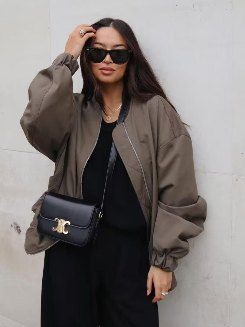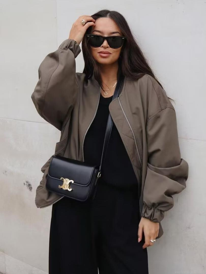 • Women's Casual Oversized Bomber Jacket Solid Color Stand Collar Long Sleeve Zipper Loose Fit Streetwear Windbreaker Coat for Women Spring Autumn