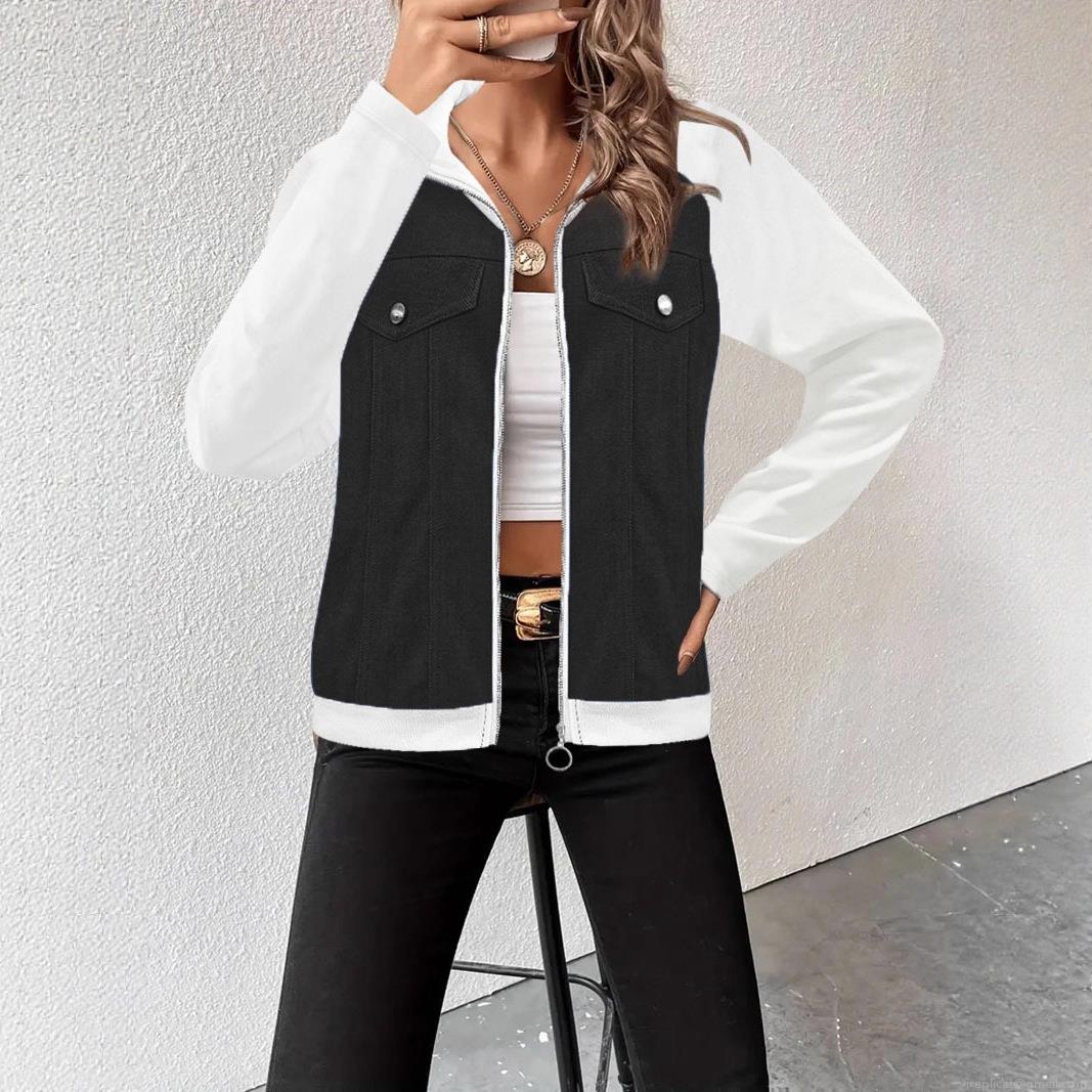 • Women's Casual Patchwork Zipper Jacket Long Sleeve Color Block Outerwear With Pockets Polyester Spandex Denim Texture Stitching Coats For Autumn Winter Streetwear