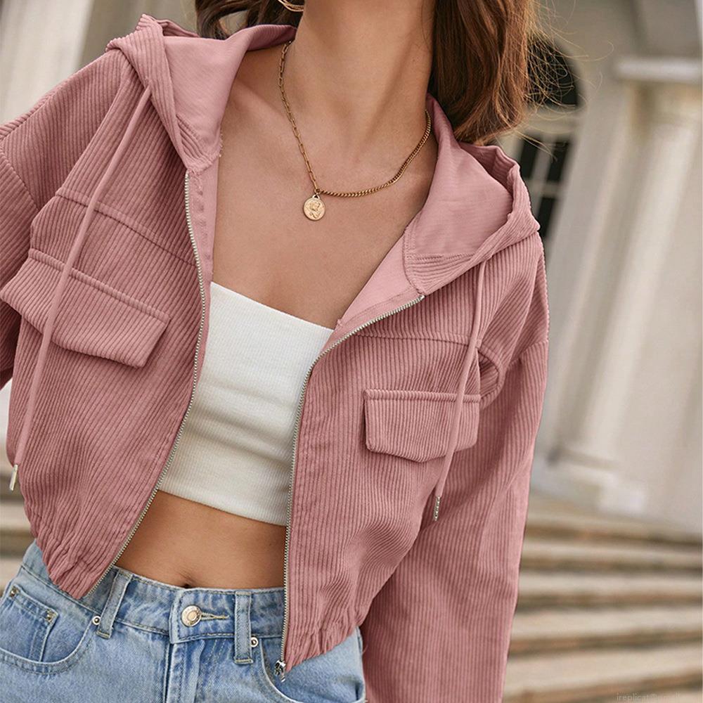 • Women's Casual Pink Corduroy Hooded Jacket Ultra Short Loose Fit Long Sleeve Zipper Coat With Pockets Solid Color Autumn Winter Streetwear Outerwear