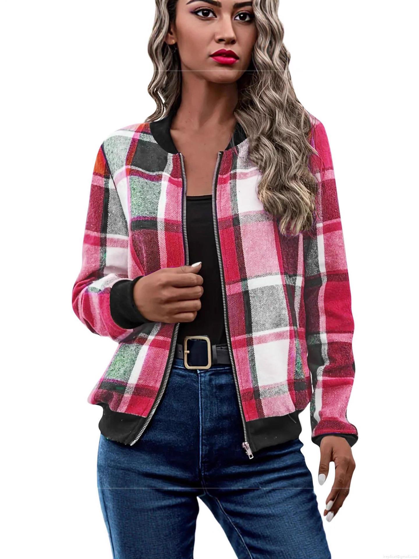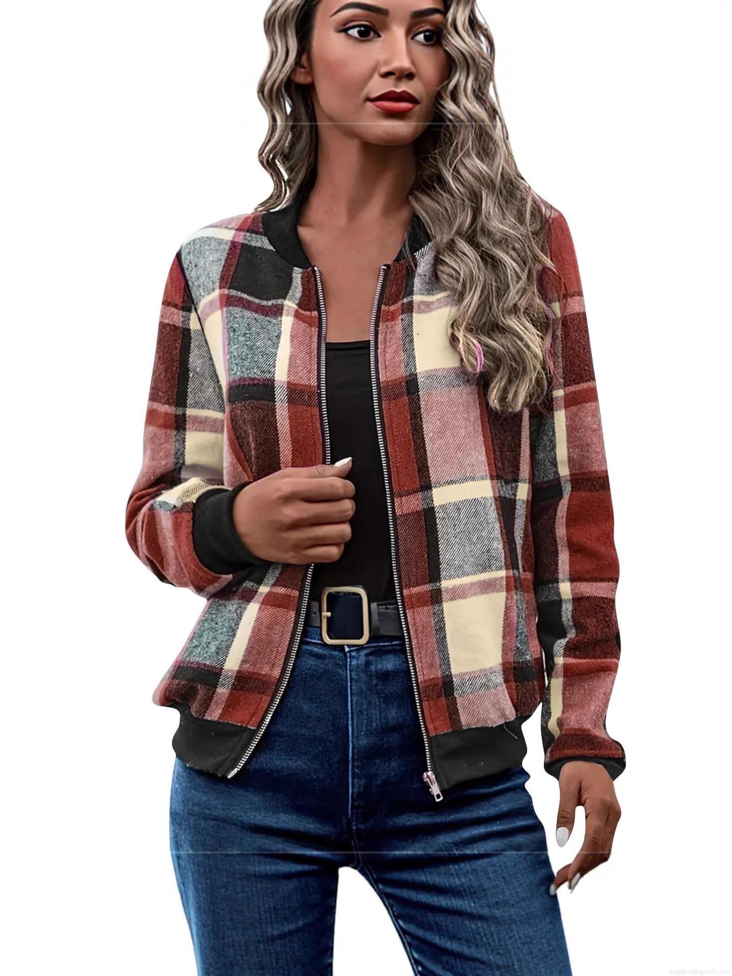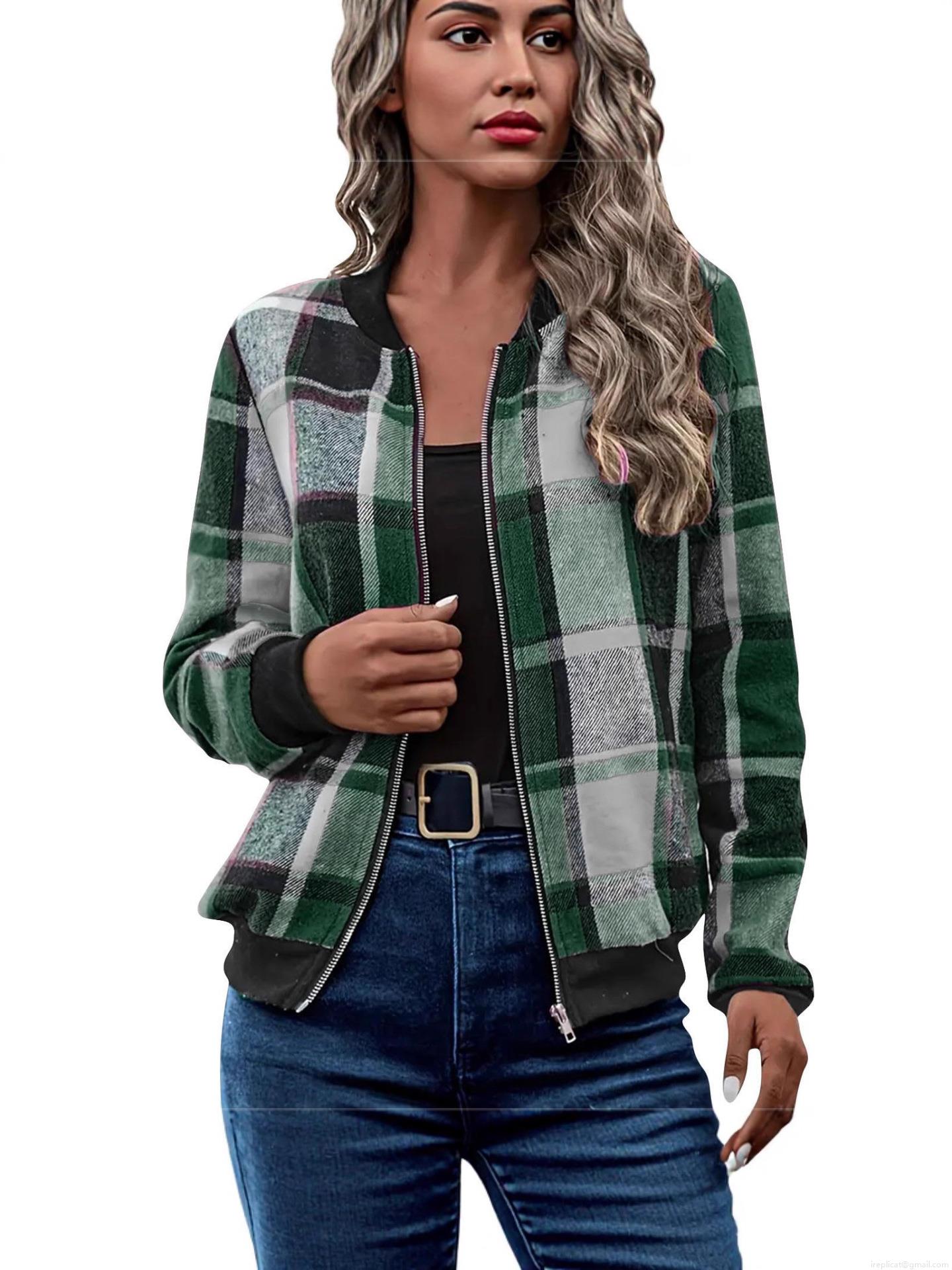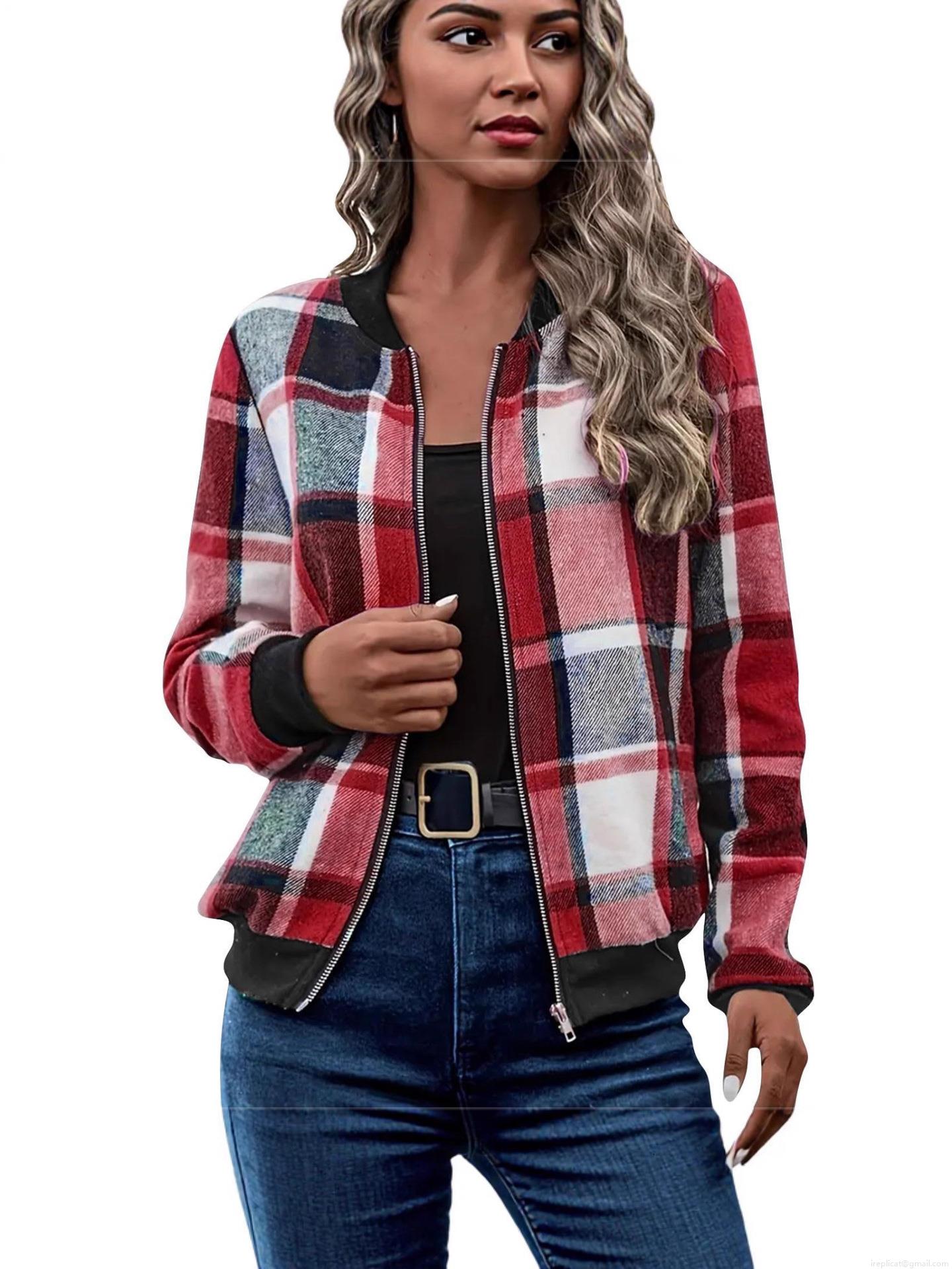• Women's Casual Plaid Checkered Zipper Bomber Jacket Long Sleeve British Style Polyester Blend Outerwear Coat For Autumn Winter Commute Wearing