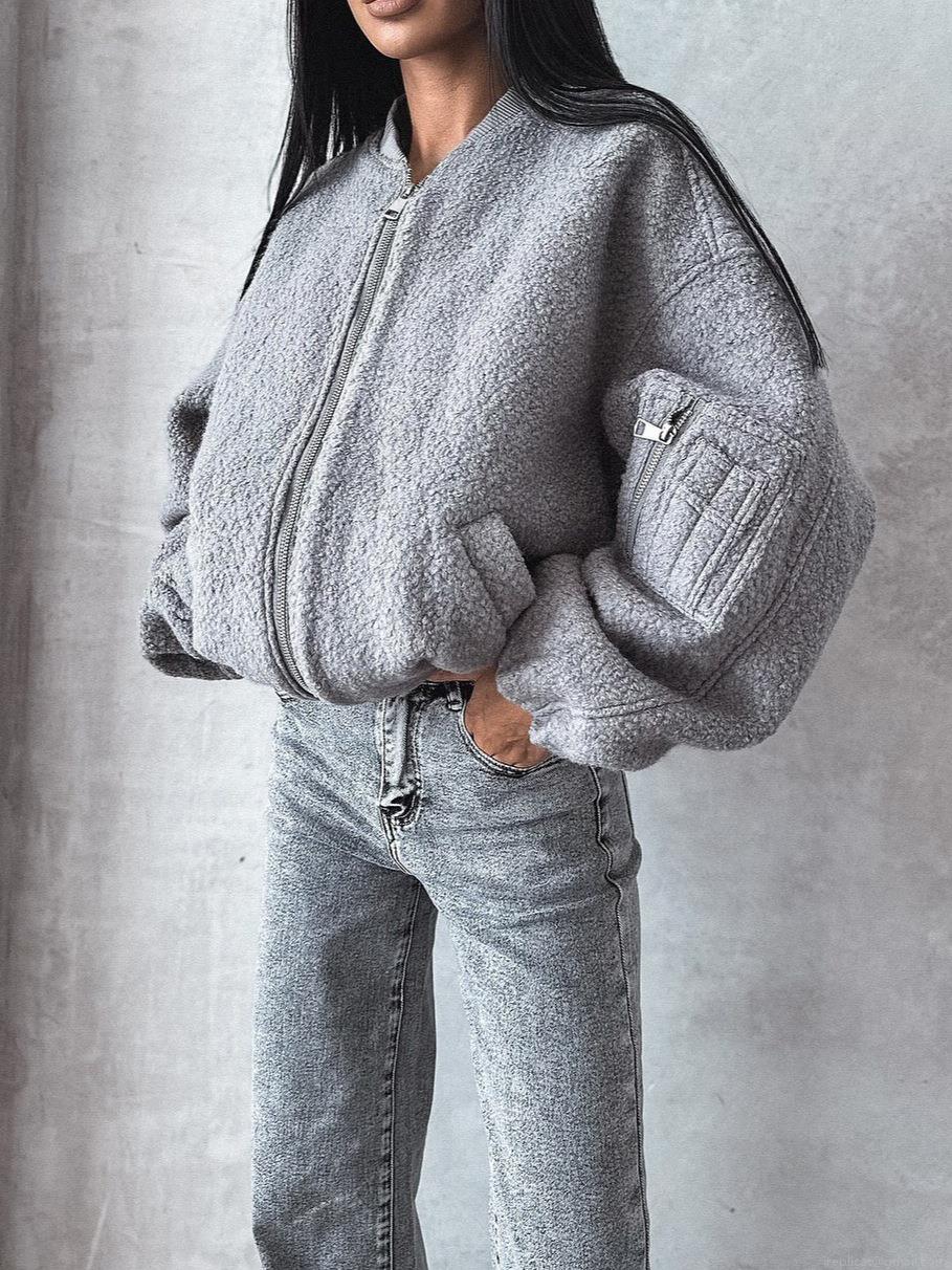 • Women's Casual Polar Fleece Jacket Stand Collar Sherpa Bomber Jacket Loose Zipper Outerwear Long Sleeve With Sleeve Pocket Autumn Streetwear